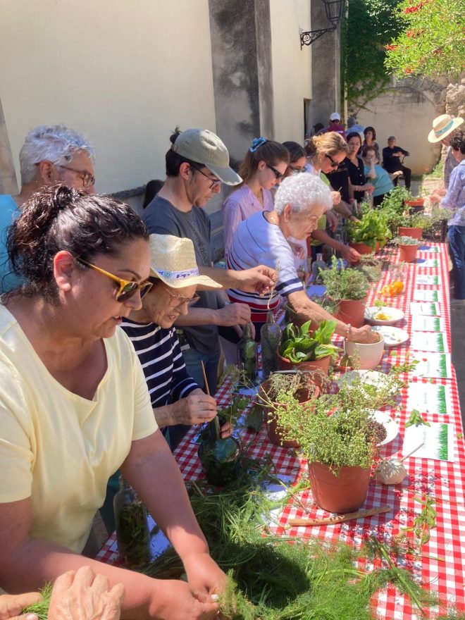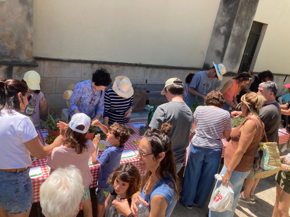 Les forces vives de l’associació ja eren a la plaça en bon dematí per preparar el dinar. Passades les deu, arribaven els mestres herbers, carregats de bones olors per preparar el circuit per on passarien els elaboradors a partir de migdia. Més d’una trentena d’herbes i fruits omplien les tres taules amb els seus cartells corresponents. Tocades les dotze, una vintena llarga de persones s’han acostat a la taula.