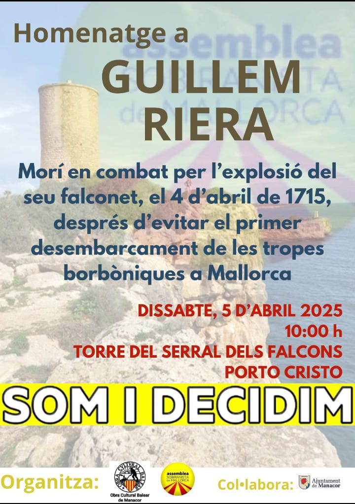L’agrupació territorial de Llevant de l’Assemblea Sobiranista de Mallorca, conjuntament amb l’Obra Cultural Balear de Manacor i la col·laboració de l’Ajuntament de Manacor, duran a terme novament l’homenatge a Guillem Riera, l’artiller mallorquí que morí en combat el 4 d’abril de 1715 mentre evitava el primer desembarcament de les tropes borbòniques a Mallorca.