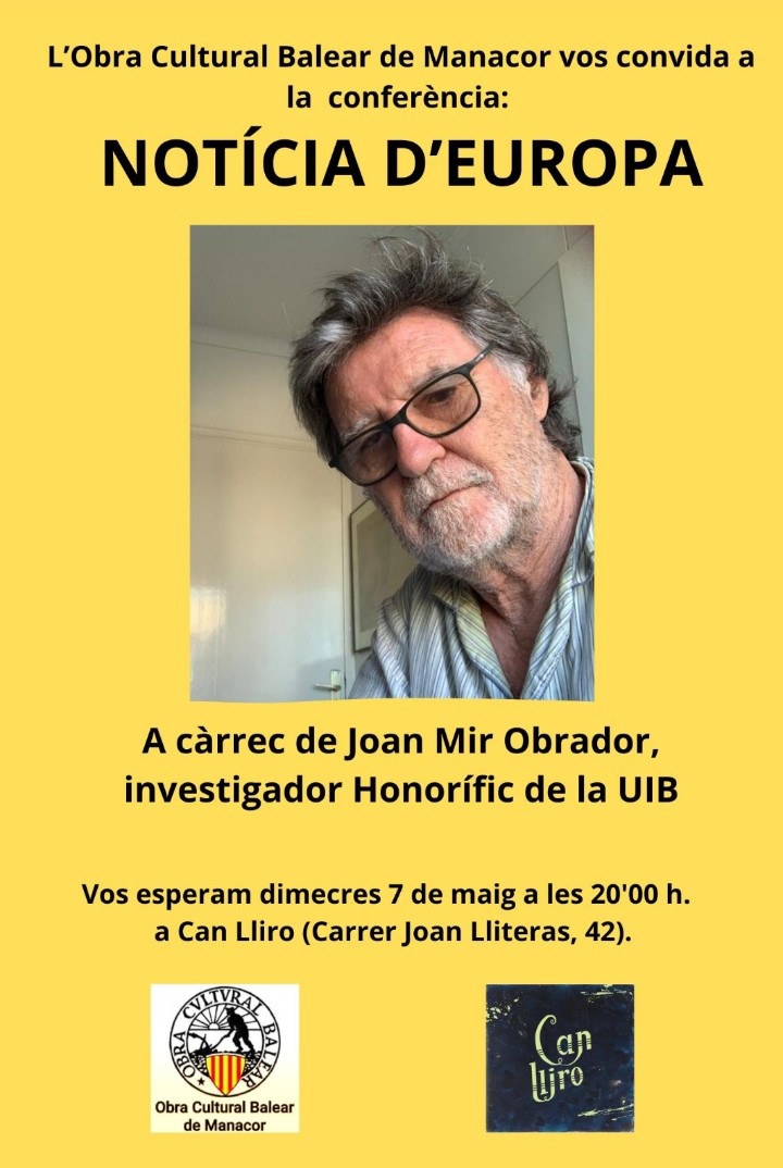 L’economista felanitxer Joan Mir impartirà dimecres dia 7 de maig a les 20h al Cafè Can Lliro de Manacor una conferència sota el títol “Notícia d’Europa”, en què mirarà de donar llum sobre l’encaix de les Illes Balears en el context europeu. L’acte forma part del cicle dels Dimecres de l’Obra, que organitza la delegació manacorina de l’Obra Cultural Balear.