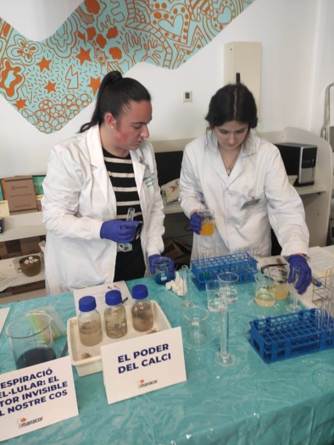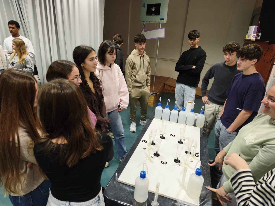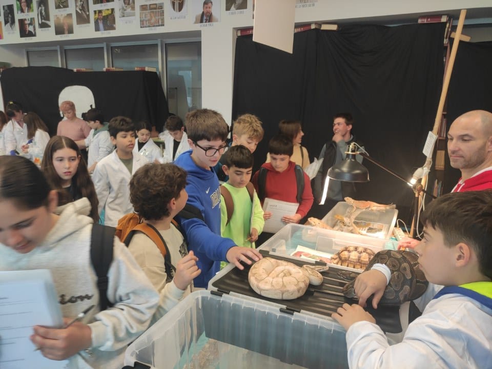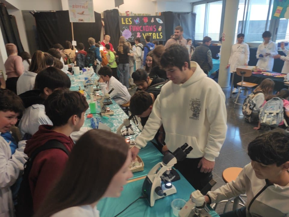 Des del departament de biologia i geologia, el tema que s’ha tractat ha inclòs les funcions de nutrició, relació i reproducció. En primer lloc, l’alumnat ens ha convidat a explorar com ens connectem amb l’entorn i com es transmet la informació genètica amb els següents experiments: exploració del sentit de l’oïda, el fascinant procés d’extracció d’ADN, experiències sensorials amb el gust, l’estudi de la reproducció de llevats, el descobriment del punt cec de l’ull, l’observació d’espermatozoides al microscopi, proves de tacte i observació de pol·len. Per altra banda, s’han duit a terme un conjunt de pràctiques centrades en la biologia aplicada i la salut, tals com l’estudi del metabolisme energètic mitjançant la competició de llevats, la respiració cel·lular i l’anàlisi de la mineralització òssia. I l’aplicació de tots aquests conceptes a la nostra vida quotidiana: la incidència de vapejar en la salut pulmonar i un test de vitamina C. Finalment, s’ha disposat d’una sèrie de rèptils aportats per la família d’un alumne del nostre centre.