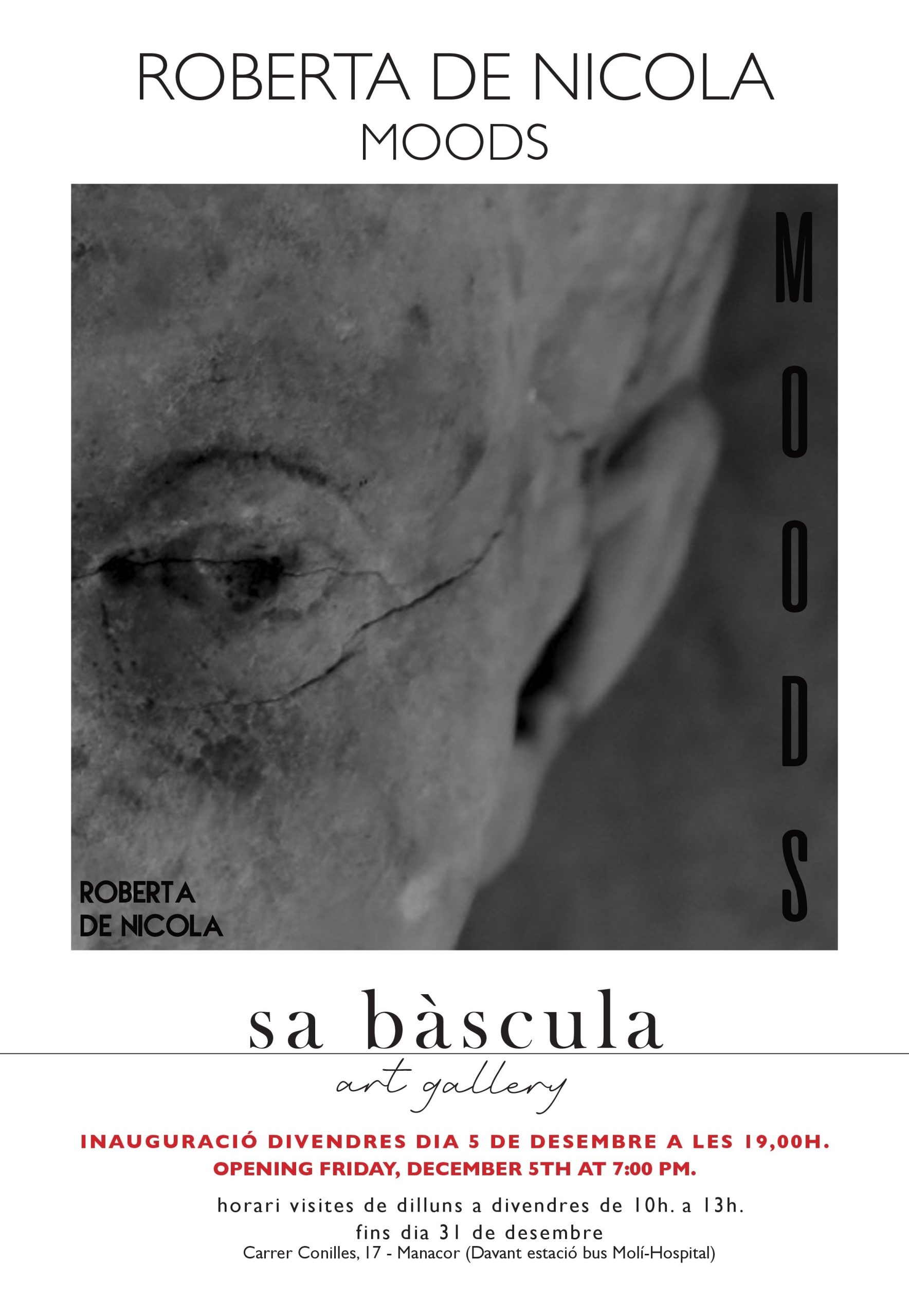 Sa Bàscula Art Gallery inaugura el pròxim divendres 5 de desembre a partir de les 19 h l’exposició Moods de l’artista fotogràfica Roberta de Nicola. Què fa que un ésser humà sigui un ésser que sent, que s’emociona o que actua instintivament? Què fa d’un bloc de pedra una obra d’art que ens desperta com un somni etern i ens torna al que és essencial? Aquestes preguntes guien a de Nicola per muntar aquesta sèrie fotogràfica conformada per 41 fotografies en blanc i negre fetes els darrers anys a localitats d’Itàlia, Suïssa i Espanya.