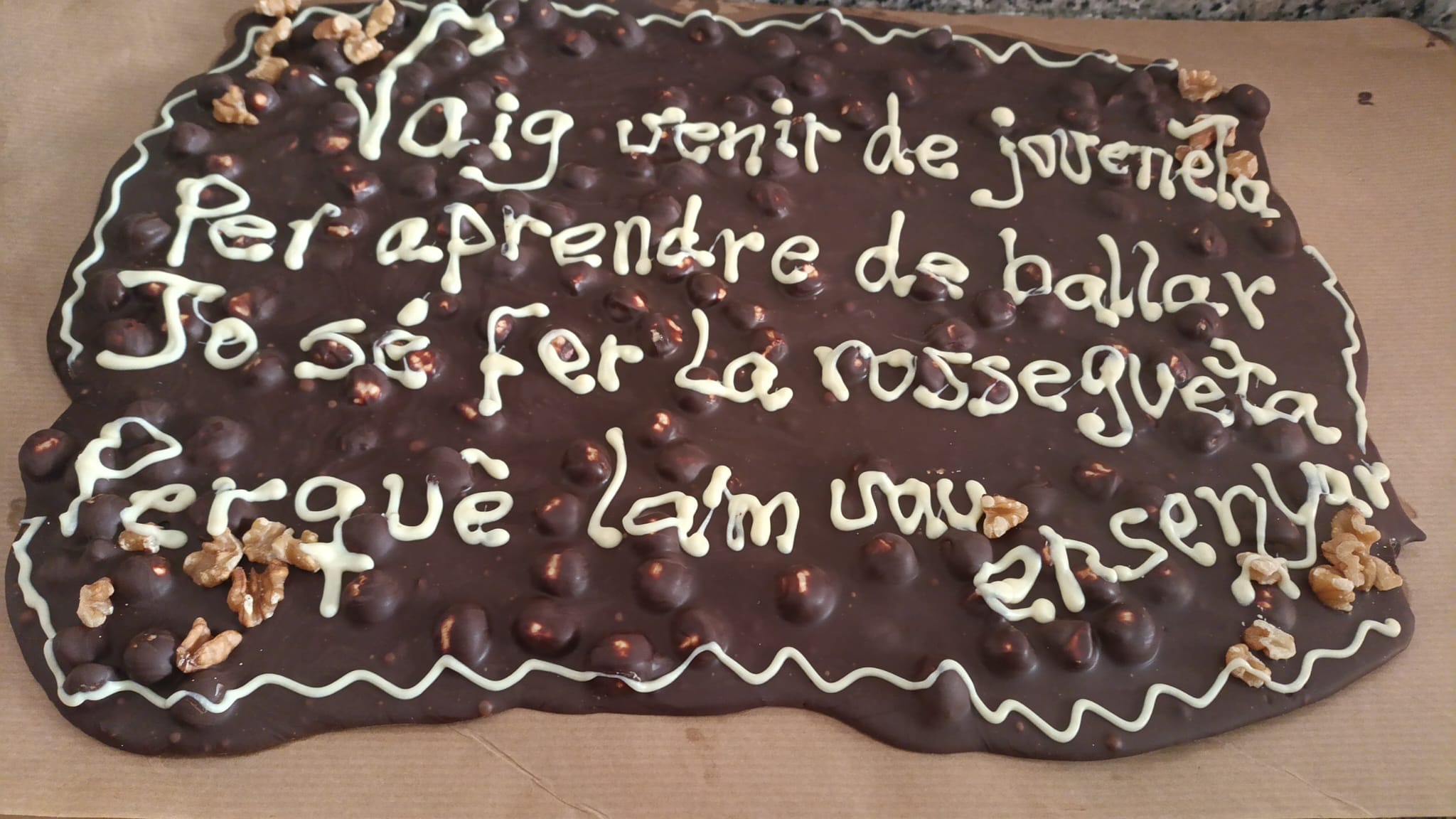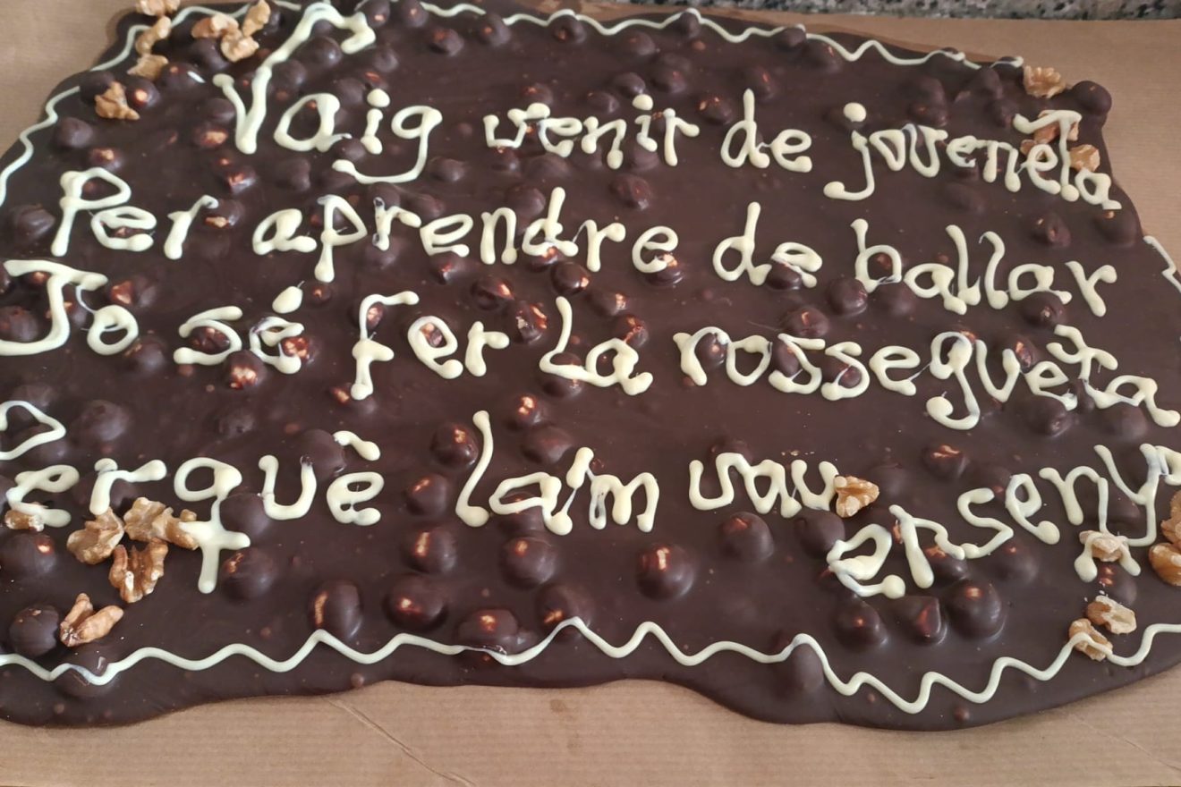 “Vaig venir de joveneta / per aprendre de ballar / jo sé fer la rossegueta / perquè la’m vau ensenyar”, deia un generós pastís de xocolata, nous i avellanes.