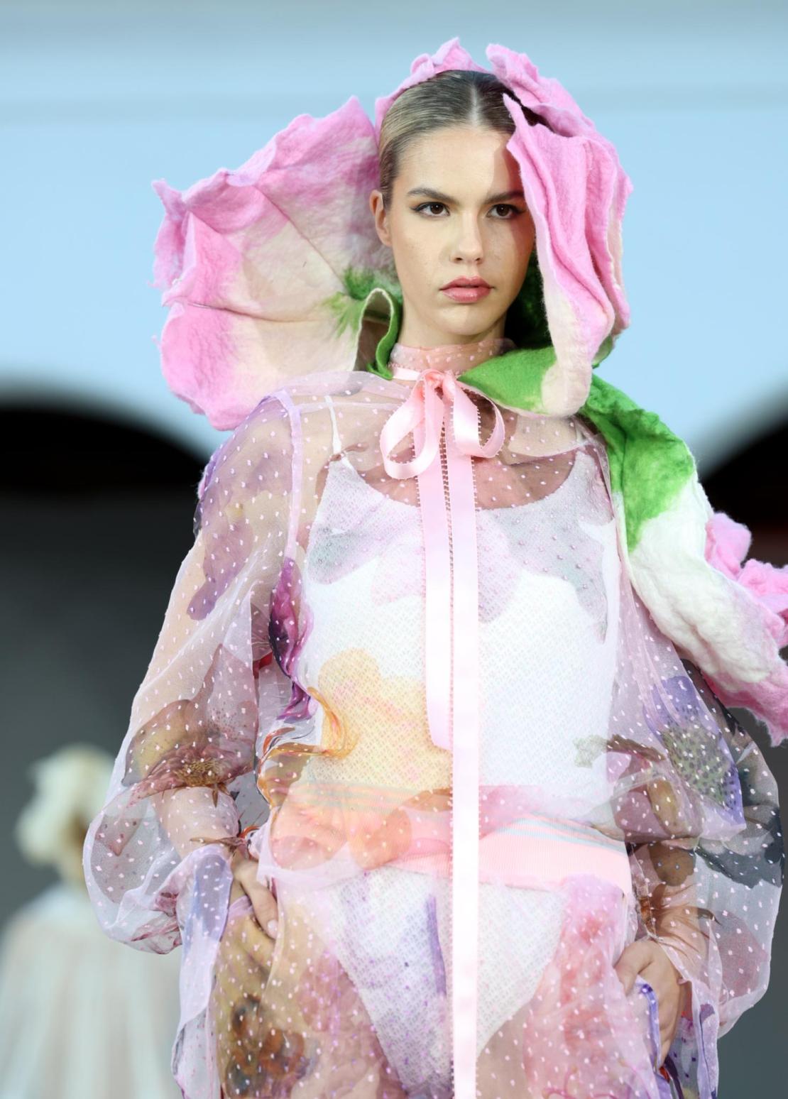 La base de la col·lecció està construïda amb teixits semitransparents que aporten lleugeresa i delicadesa, contrastant amb elements esculturals elaborats en resina i feltre. En aquesta passarel·la la dissenyadora va triar 6 peces de tota la col·lecció perquè hi havia 6 models, però explica que tota la col·lecció es basa en la mateixa línia relacionada amb l’arquitectura i el volum: partint d’un vestit, s’inspira en una peça en el cos que suporta un tocat al cap. Així es dona lloc a una col·lecció heterogènia, amb una roba que té moviment així com tocs eteris i gasosos. Pel que fa a les tècniques, ha emprat feltre, enfeltrant ella mateixa la llana, però també ha usat resines per màscares i tocats així com teles. “Tot ho he fet jo, ho he cosit tot jo i m’agrada per exemple que els estampats, les flors i les decoracions donen un simbolisme i atorguen textura al conjunt”.