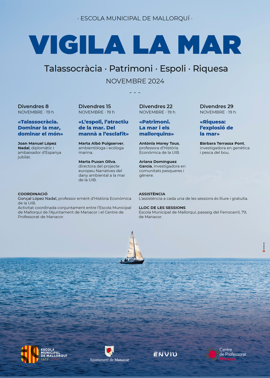 L’Escola Municipal de Mallorquí, en col·laboració amb el Centre de Professorat de Manacor, presenta un nou cicle monogràfic de conferències sota el títol “La mar, entre la generositat i el perill”, que tendrà lloc al llarg del proper mes de novembre. Aquest cicle té com a objectiu reflexionar sobre el paper històric, econòmic i cultural de la mar en la vida dels mallorquins, i explorar la fràgil relació entre la seva explotació i la sostenibilitat. Es convida la ciutadania a participar en aquest cicle per aprofundir en el coneixement de la relació de Mallorca amb la mar. El cicle està coordinat per Gonçal López Nadal, professor emèrit d’Història Econòmica de la UIB i les sessions es duran a terme a l’Escola Municipal de Mallorquí. L’assistència a les conferències és lliure i gratuïta i que presenten amb aquestes paraules: “Blai Bonet va anomenar El mar la seva novel·la. I, al seu torn, Agustí Villaronga la transformaria en imatges. Poc abans de deixar-nos, el cineasta mallorquí ens va mostrar també l’altra cara, la més feixuga, El ventre del mar. Somnis en colors; tristor en blanc i negre. Deliri versus revenja. «Vigila el mar —canta Maria del Mar Bonet— que la pluja no és teva i el sol enlluerna poc a poc». Deixem de banda els cants de sirena i toquem mar(e). Abordem-la. De les moltes talaies des d’on contemplar-la — des de les més pròpiament econòmiques fins les més literàries i/o artístiques— n’hem triat quatre. Som conscients que les opcions són inabastables. En aquest cicle, hem optat per dues dissertacions que abraçaran obrint i tancant, dues sessions centrals xerrades en forma de diàleg. Partim d’enfocament distints; car en ells conflueixen ambdues cares, la de la generositat i la del perill. Aquesta magnanimitat té la seva torna en els desgavells causats per la sobreexplotació de la mar, el fals manà, i el seu esclafit, que preludien sinistres perfectament evitables. Com l’abisme, la mar atreu i sedueix, però també ens atemoreix i ens mata”.