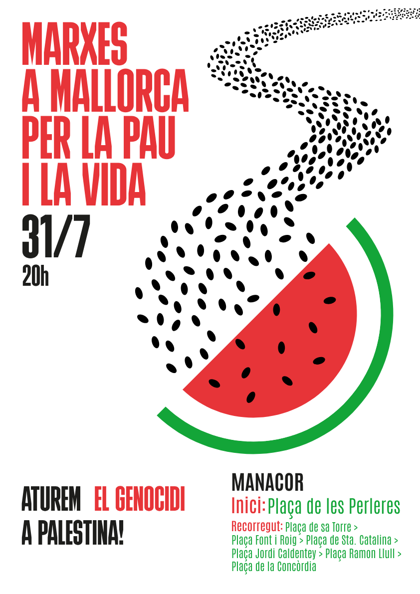 Les organitzadores expliquen que “a tot Mallorca el proper dia 31 de juliol de les 20 a les 22 hores, es faran marxes simultànies de protesta. A 42 pobles i a 4 barriades de Palma (llistat adjunt), sortirem al carrer alhora, per mostrar la nostra solidaritat amb el poble palestí i l, exigència de que s, aturi ja aquesta devastació i la complicitat dels estats”.