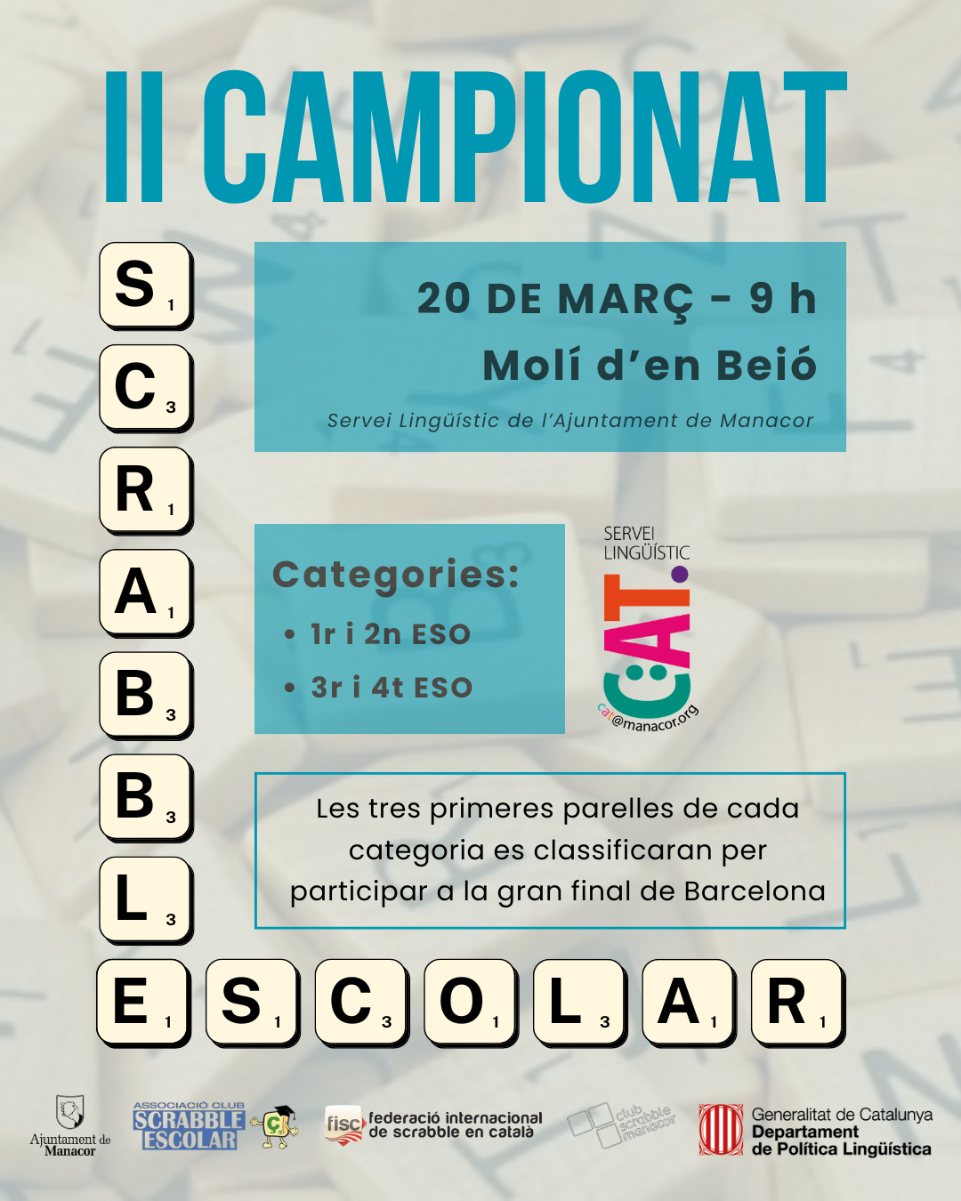 La fase classificatòria del Segon Campionat de Scrabble Escolar tendrà lloc aquest divendres dia 20 de març al Molí d’en Beió. El campionat es disputarà en dues categories, separant els equips de 1r i 2n d’ESO dels de 3r i 4t d’ESO. Les tres primeres parelles classificades de cada categoria obtindran el pas per representar Manacor a la gran final del campionat, que tindrà lloc el dimarts dia 28 d’abril a Barcelona.