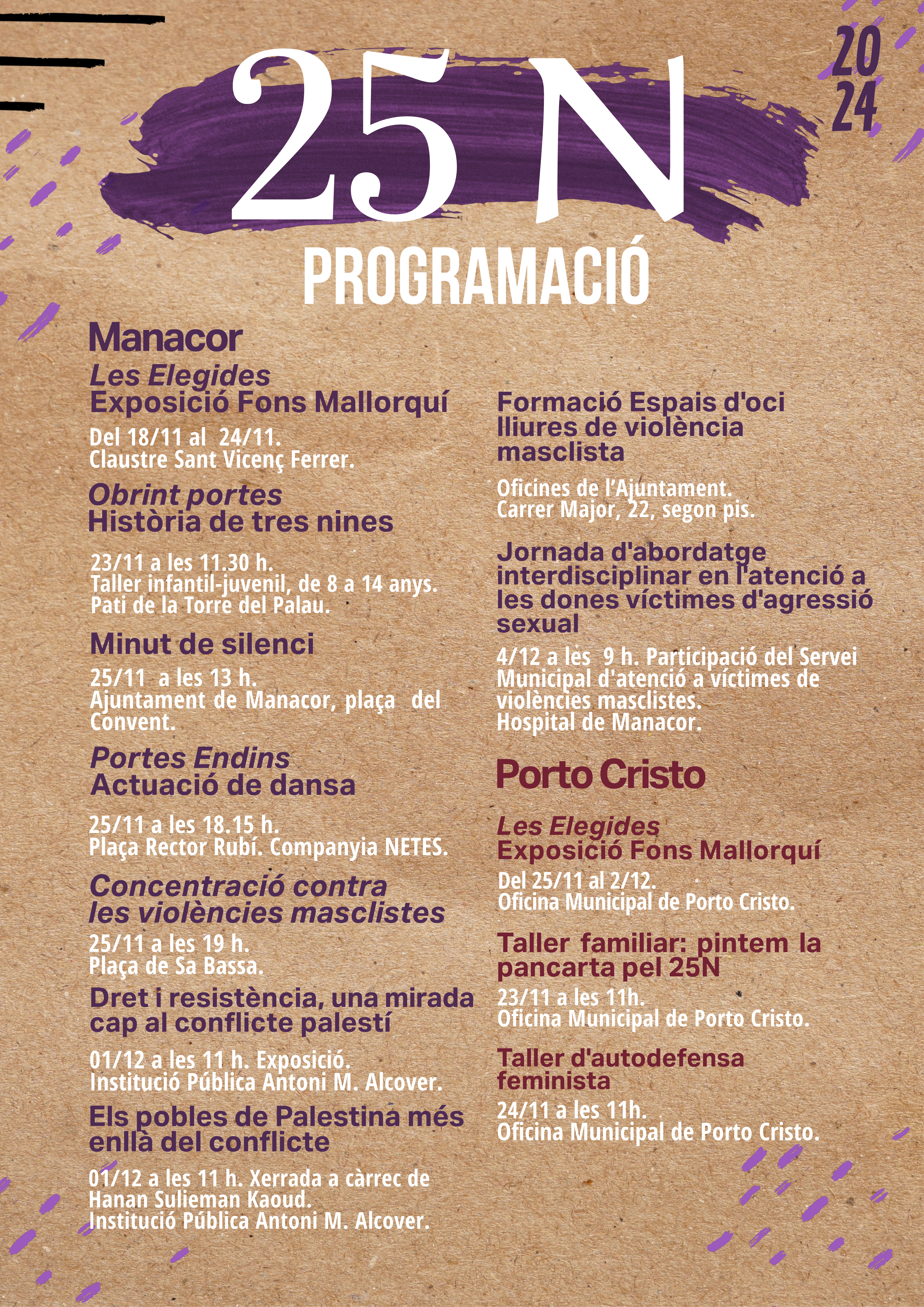 Seran dues setmanes amb diverses activitats i esdeveniments entre les quals hi trobam el taller ” Obrint portes. Història de tres nines”, destinat a infants i adolescents d’entre 8 a 14 anys que tendrà lloc el proper dissabte dia 23 de desembre a la Torre del Palau, un minut de silenci davant la Sala – a la plaça del Convent – a les 13 h o l’actuació de dansa Portes Endins, a càrrec de la companyia Netes. A les 19 h el Col·lectiu de Dones de Llevant convoca la concentració contra les violències masclistes a la plaça de sa Bassa. Dia 1 de desembre a partir de les 11 h, la Institució Pública Antoni M. Alcover acollirà l’exposició Dret i resistència, una mirada cap al conflicte palestí, i també la xerrada a càrrec de la dona palestina Hanan Sulieman Kadoud sota el títol d’Els pobles de Palestina més enllà del conflicte.