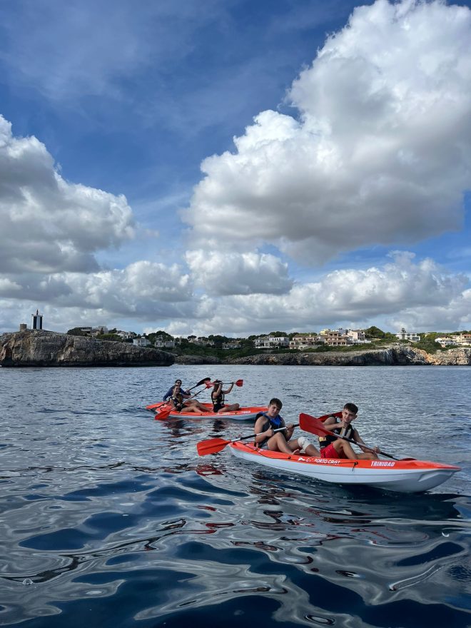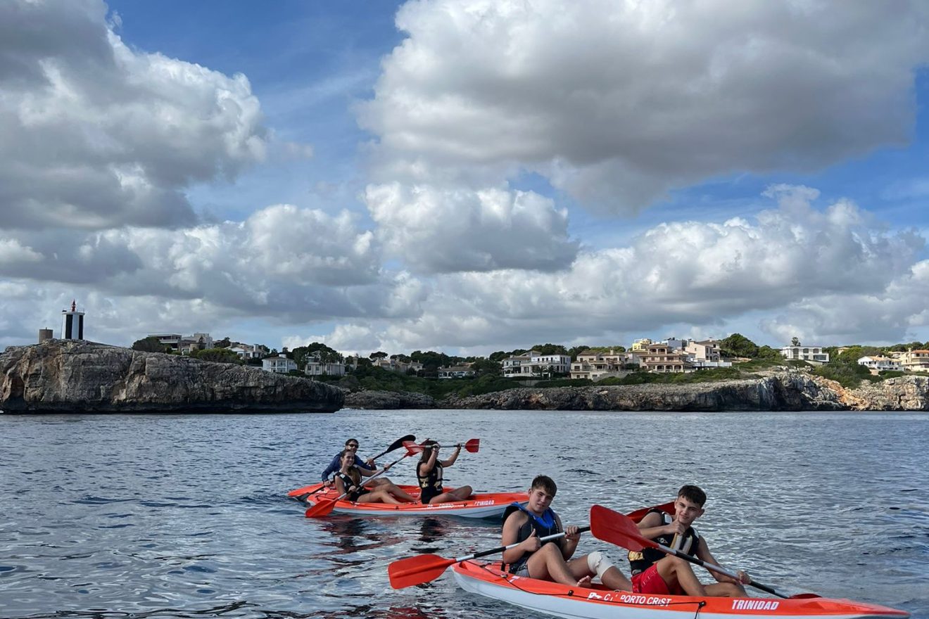 Al cap d’una hora de navegar, ha estat l’hora dels caiacs i s’han desplaçat fins a les Coves Blanques, on varen viure les primeres famílies pescadores de Portocristo. L’alumnat ha fet la ruta per la Cova dels Correus, l’Enterrossai, la caleta del Far i, per acabar, han navegat fins a la cova de la Torre dels Falcons, torre de vigilància comunicada visualment amb altres torres del nostre litoral.
