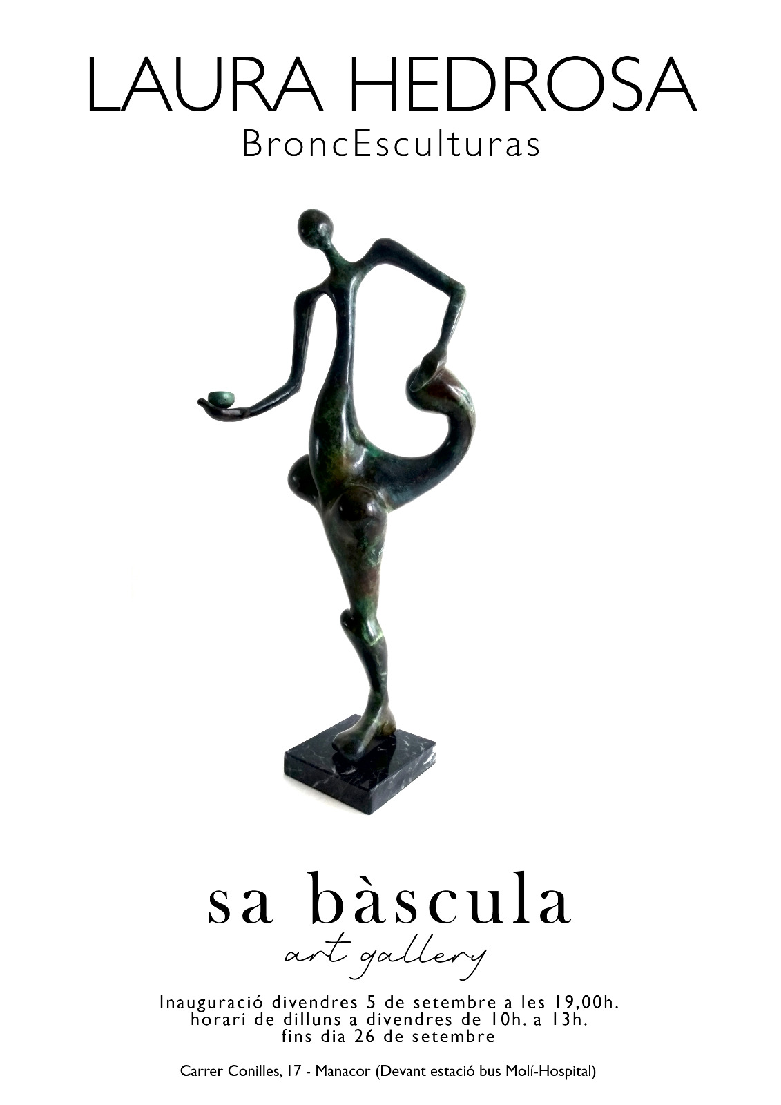 Nascuda a Guadalajara i resident de fa temps a Artà, l’escultora Laura Hedrosa inaugura exposició dia 5 de setembre, a partir de les 19h a la sala Sa Bàscula. Les seves peces estaran exposades fins dia 26 del mateix mes i la mostra es podrà visitar entre les 10 i les 13h de dilluns a divendres.