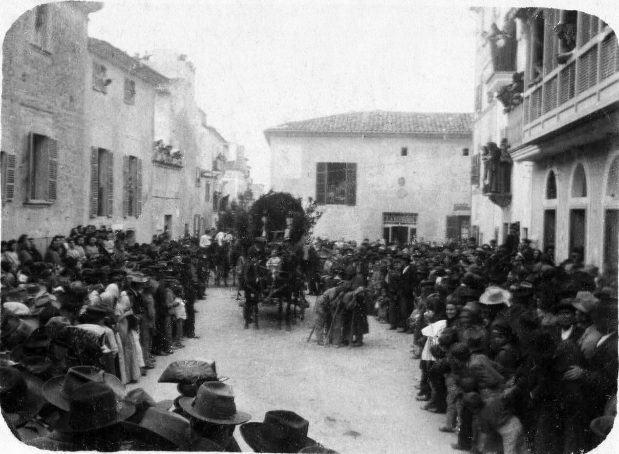 *Instantània d’unes beneïdes celebrades a la plaça del General Weyler a finals del segle XIX. Darrere el carro de sa Colcada s’aprecia un grup de genets.