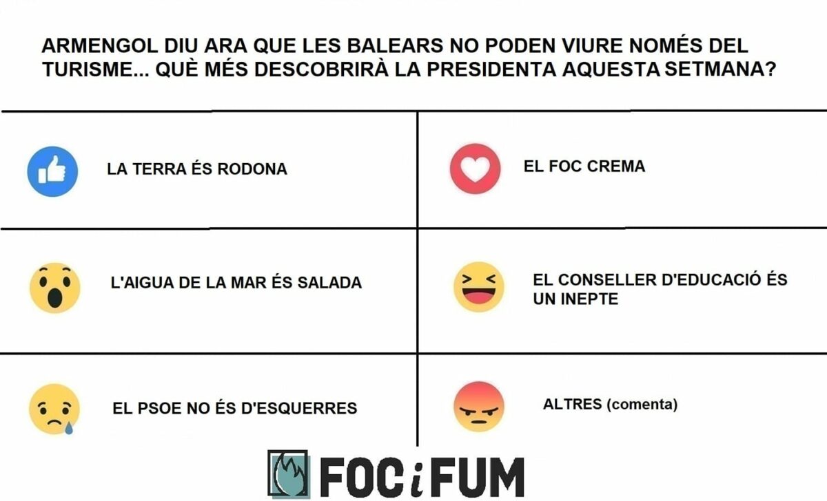 La presidenta Armengol, en una nova demostració de no perspicàcia, ha dit que “això és un indicatiu inequívoc de que la situació de la pandèmia ha millorat, i de que la concepció que tenen els ciutadans de la gestió del govern és immillorable”. Ha puntualitzat però que el lema podria estar també en castellà: “que no paregui que som nacionalistes”. Finalment, l’associació de persones cegues de Palma ha manifestat sentir-se profundament ofesa per l’ús del verb veure.