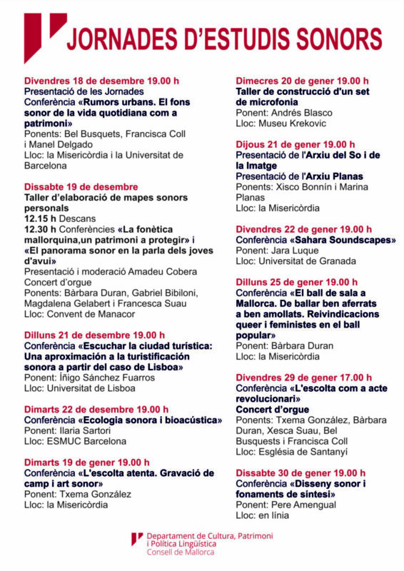 En aquest sentit que el departament de Cultura, Patrimoni i Política Lingüística del Consell de Mallorca sota la direcció de la directora general Kika Coll ha programat unes Jornades d’Estudis Sonors que presenten un sistema d’assistència i difusió compatible amb els temps de pandèmia. Els coordinadors de les Jornades Txema González de Lozoyo i Bàrbara Duran han dissenyat un format que permet seguir les aportacions directament, però també en diferit mitjançant el canal de Youtube del Consell de Mallorca, on s’aniran penjant les diferents conferències.
