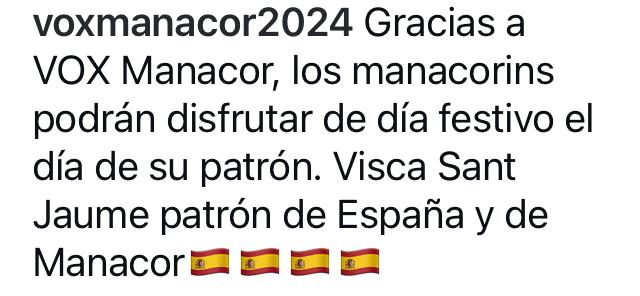 Ni la imatge que feren servir, ni el text, han de passar per malla a qualsevol observador de l’actualitat. En el missatge del post que compartiren hi deia, en traducció nostra: “Gràcies a Vox Manacor, els manacorins podran gaudir de dia festiu el dia del seu patró. Visca Sant Jaume, patró d’Espanya i de Manacor”, i acompanyaven l’escrit de quatre simpàtiques banderetes espanyoles, vaja, com si Sant Jaume fos patró d’Espanya quatre vegades i no ho fos cap de Manacor.