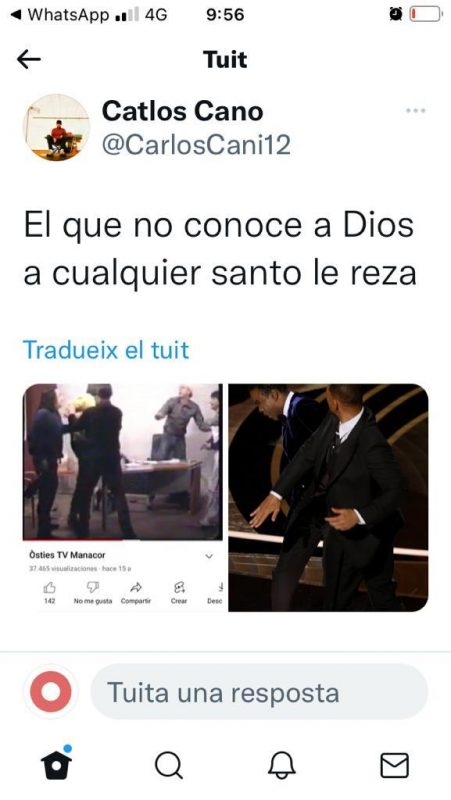 Sens dubte una de les notícies, si se’n pot dir així, més comentades de la setmana, ha estat la galleta de Will Smith al presentador de la gala dels Oscars de Hollywood, després que aquest fes referència als pocs cabells de Jade Pinkett, esposa de l’ara ja flamant guanyador de l’estatueta al millor actor. El cas és que mentre uns hi han vist una actitud violenta amb tics masclistes i dominants, d’altres s’han mostrat més condescendents amb l’hòstia smithiana, en considerar que qui havia ofès primer havia estat el còmic presentador, que no va tenir en compte, o si, que Jade Pinkett fa anys que lluita contra l’alopècia. El cas és que el referent del tuitisme manacorí Catlos Cano ha volgut comparar l’hòstia de l’actor americà amb els tocs, ja històrics, que va rebre el periodista Pep Matas al programa De Tot i Molt, conduït per l’inefable i enyorat de tanta gent Miquel Àngel Ariza. Evidentment, qui guanya per Cano, són les hòsties manacorines, i sobretot, la protecció utilitzada per matas, tota una paleta de ping-pong. Ja és còmic, també, que la pel·lícula de Will Smith vagi de tennis…f