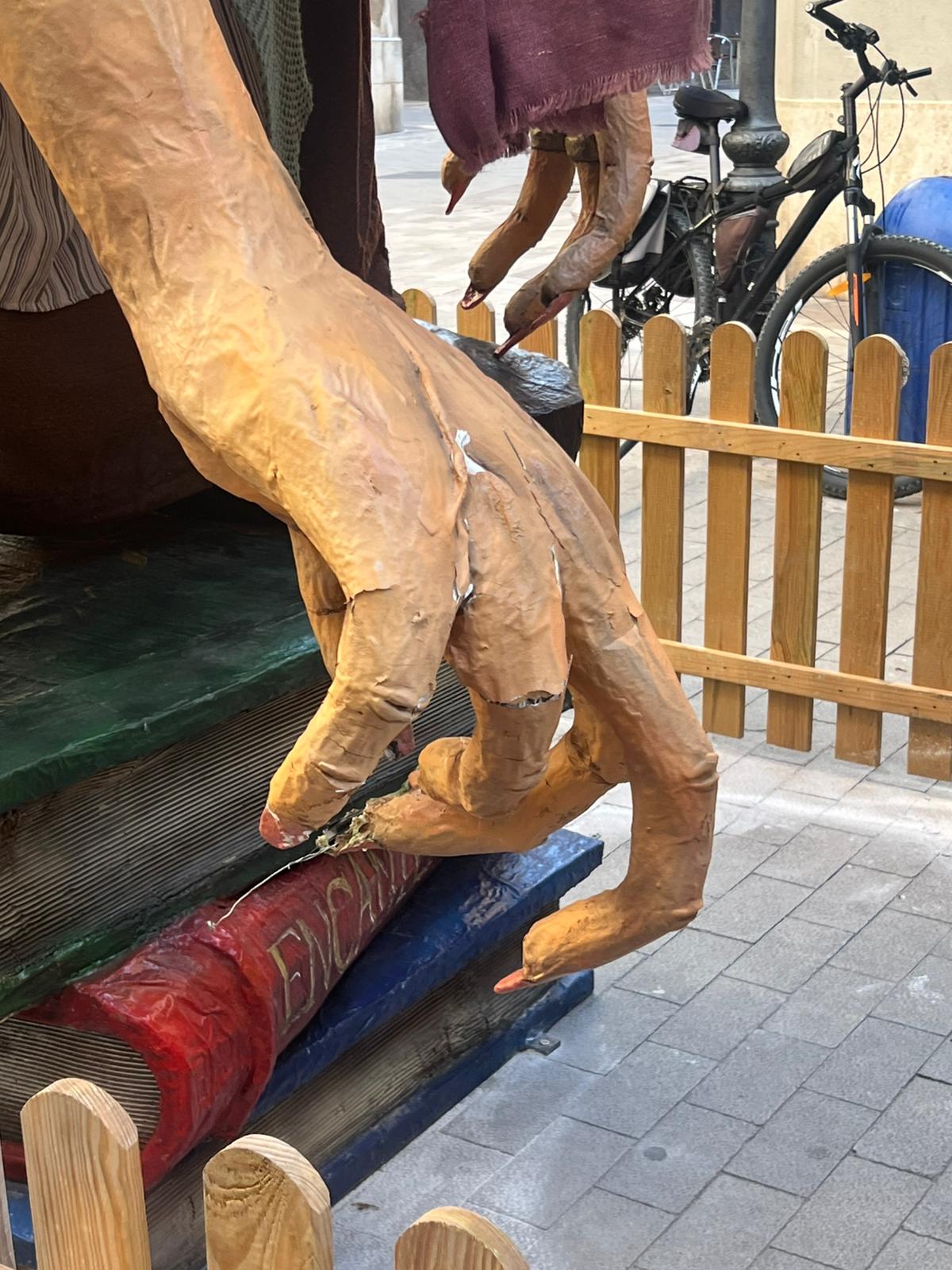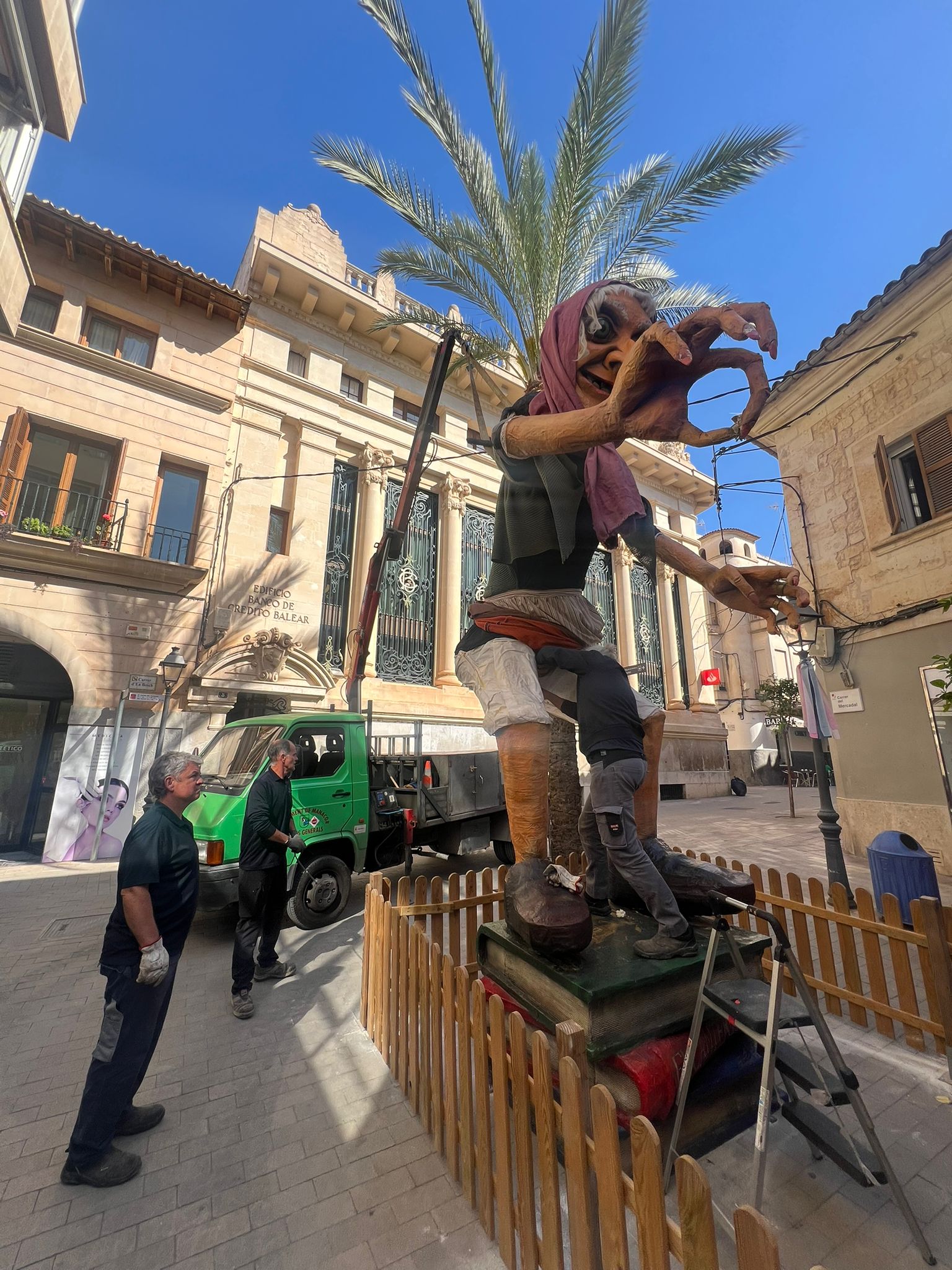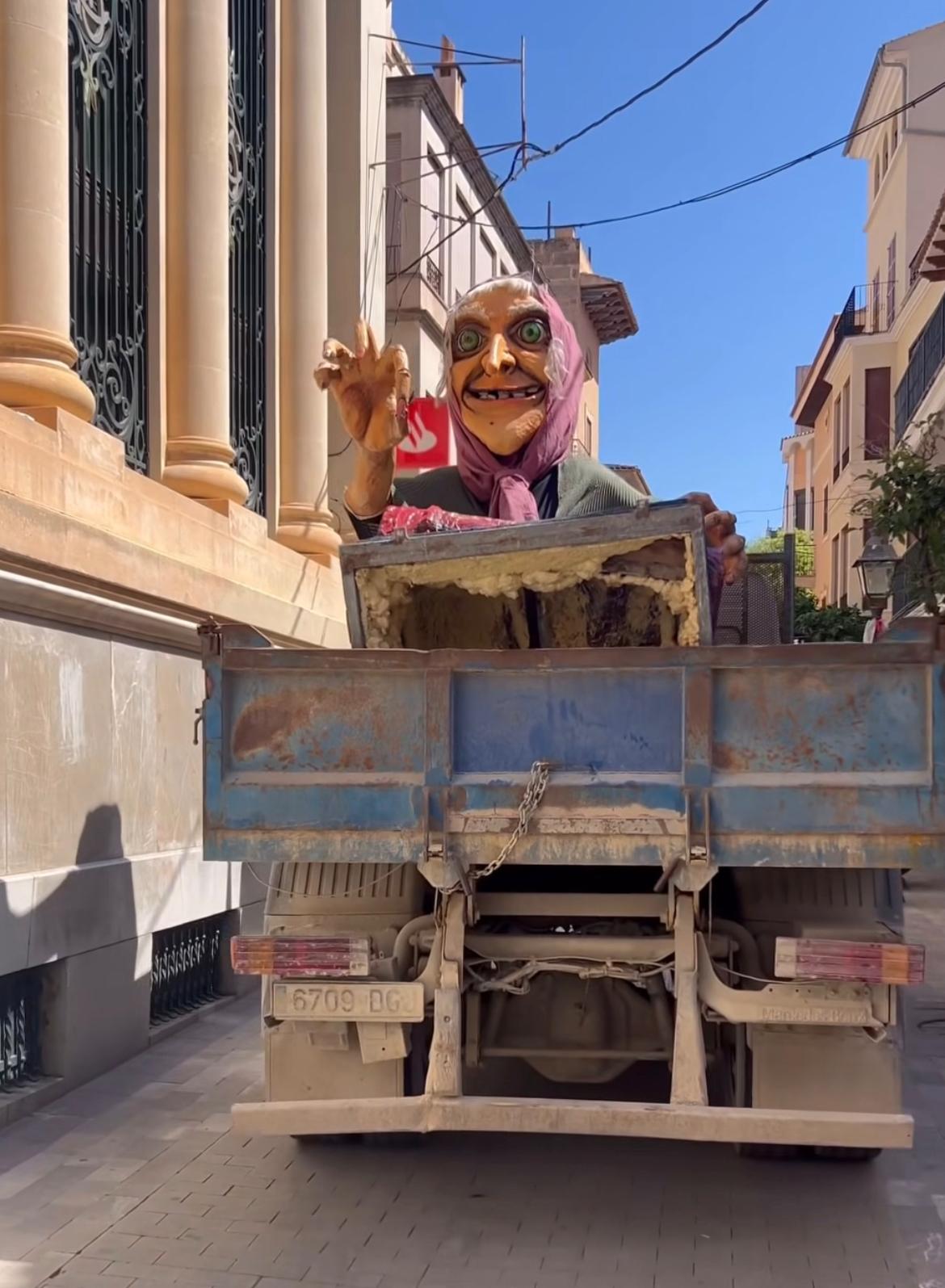 “Hem vengut amb la brigada, hem duit una grua i hem mirat d’aixecar la bruixa. L’hem aixecada i hem pogut mirar com estava per dins, així com l’estructura i realment està tot vinclat”, explica en una publicació a xarxes un dels creadors de les figures, Sebastià Riera Pocoví, que afegeix que varen fer tanta força penjant-se del braç i estirant el granot que tota l’estructura ha resultat malmesa. “Hem fet tot el que hem pogut, però ara l’estructura se n’ha d’anar”.