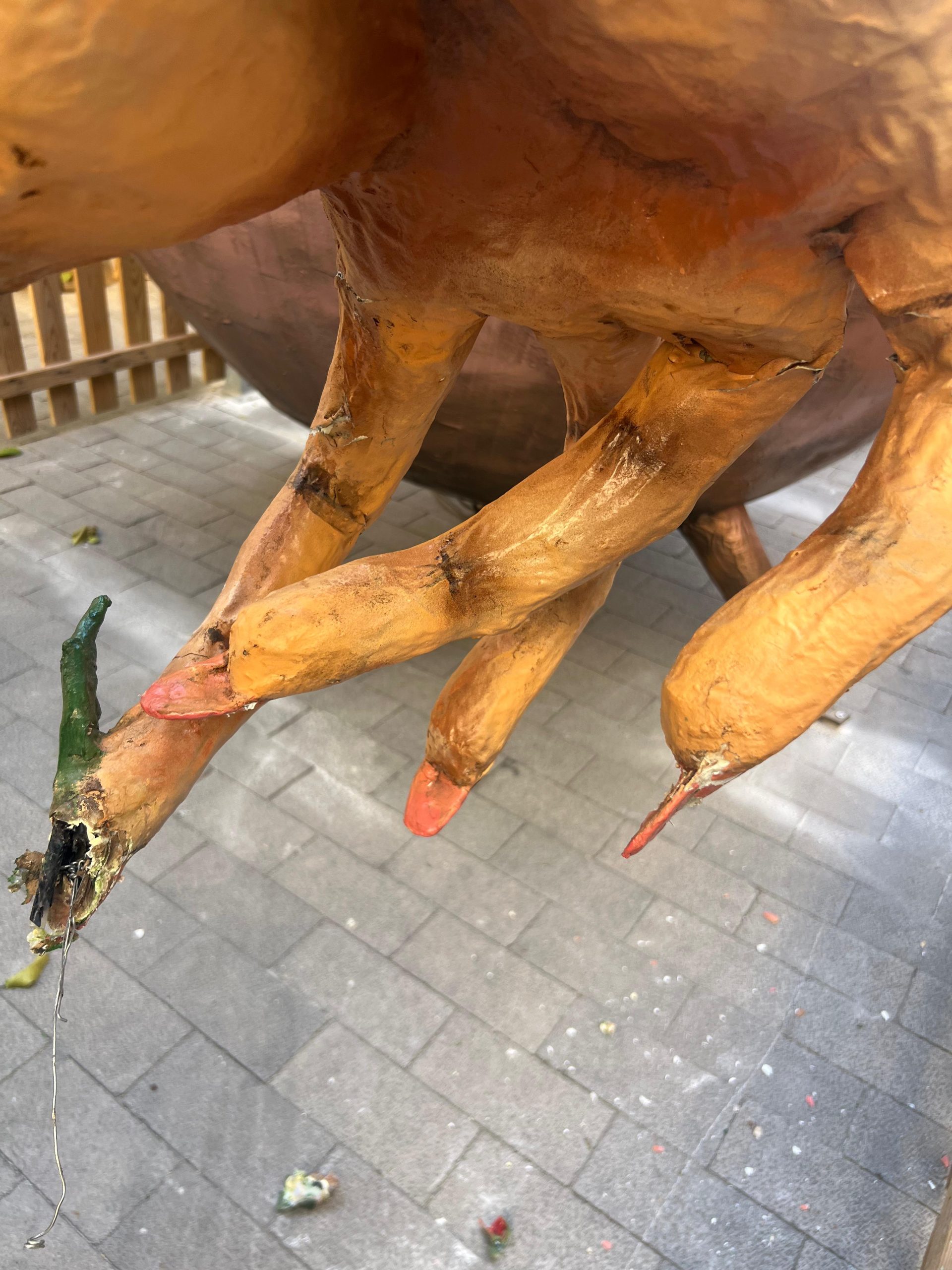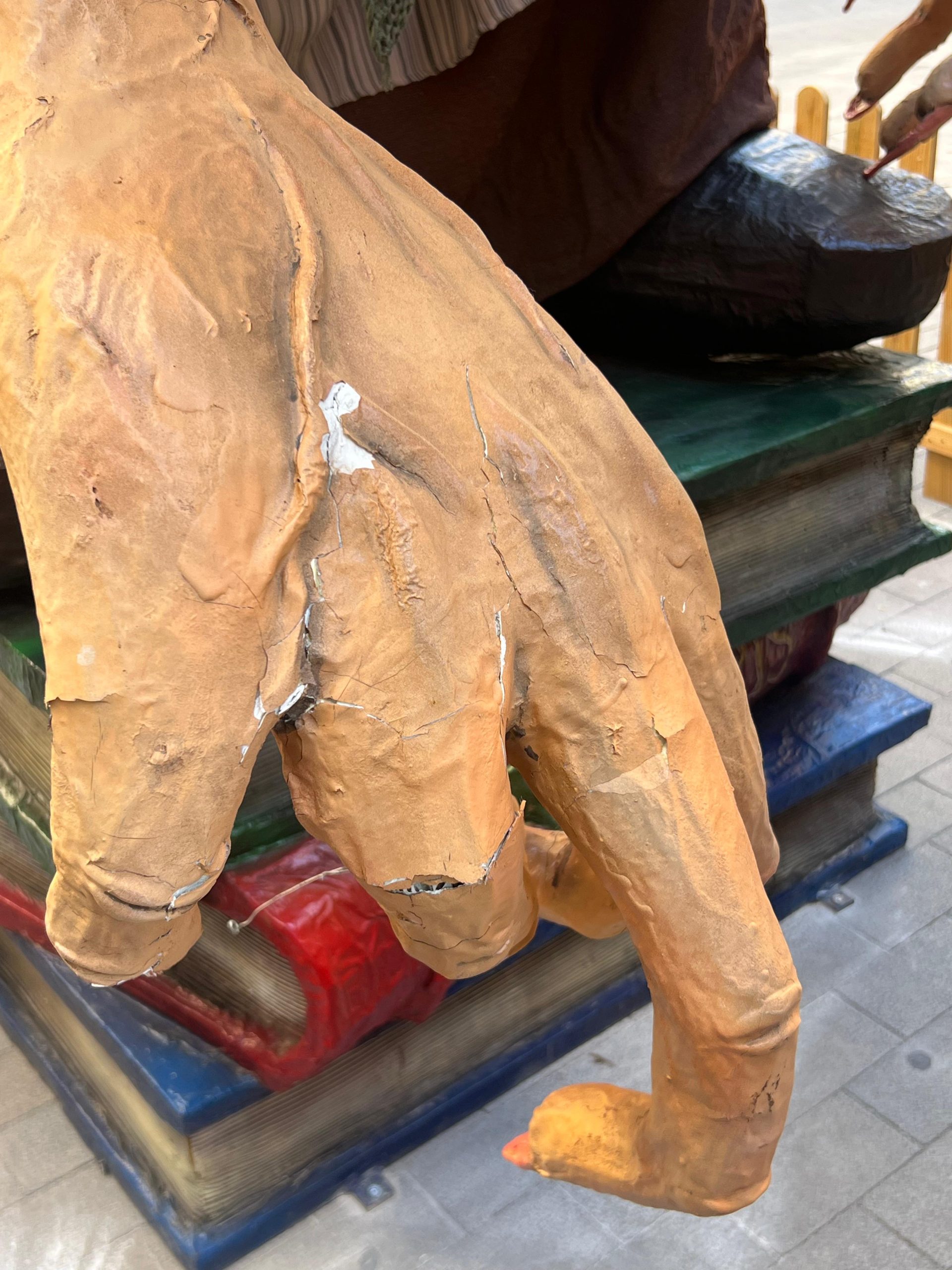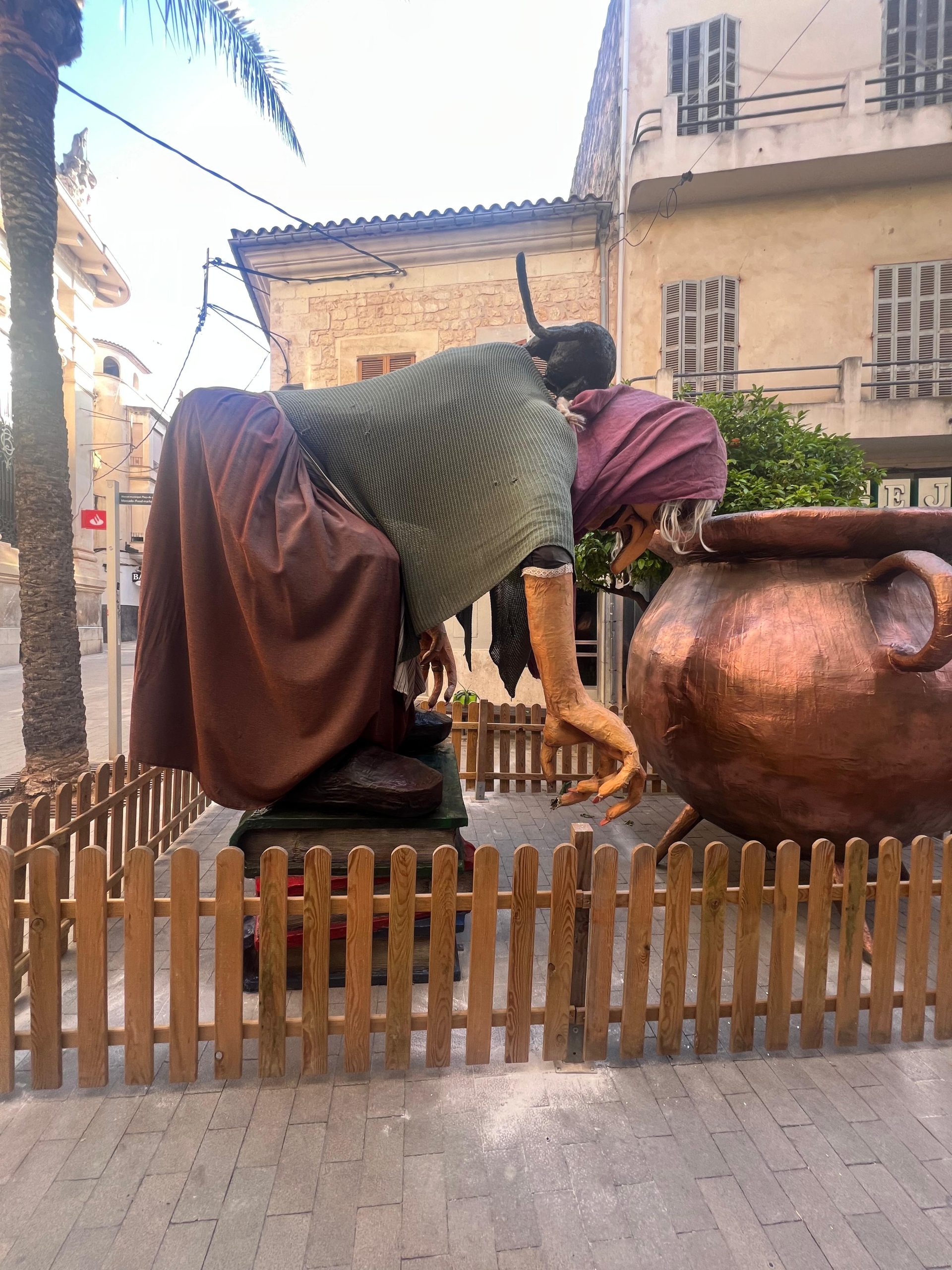 “Hem vengut amb la brigada, hem duit una grua i hem mirat d’aixecar la bruixa. L’hem aixecada i hem pogut mirar com estava per dins, així com l’estructura i realment està tot vinclat”, explica en una publicació a xarxes un dels creadors de les figures, Sebastià Riera Pocoví, que afegeix que varen fer tanta força penjant-se del braç i estirant el granot que tota l’estructura ha resultat malmesa. “Hem fet tot el que hem pogut, però ara l’estructura se n’ha d’anar”.