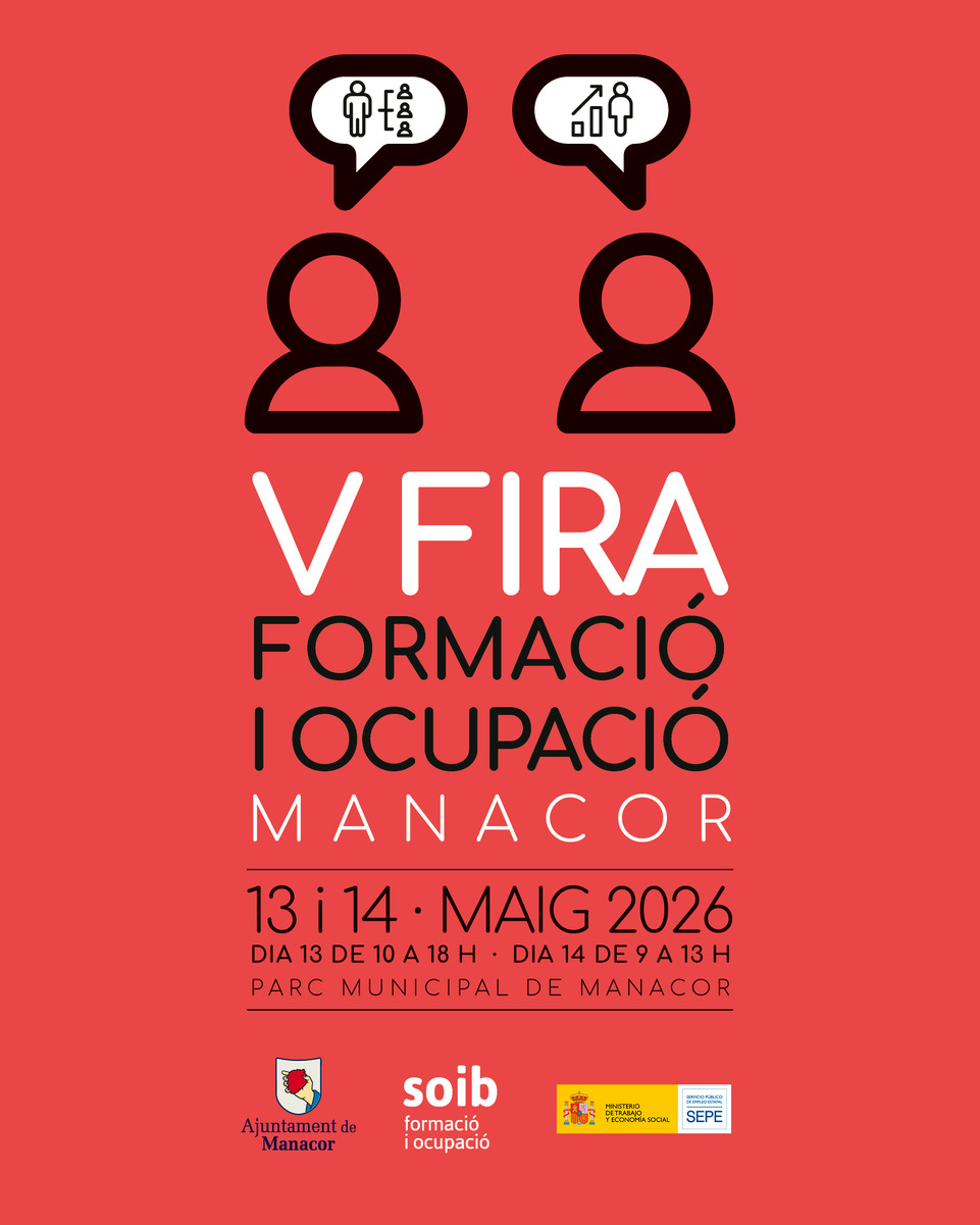 La V Fira de Formació i Ocupació està organitzada pel Departament de Promoció Econòmica i Desenvolupament Local de l’Ajuntament de Manacor, en el marc del programa SOIB Desenvolupament Local 2026-2027.