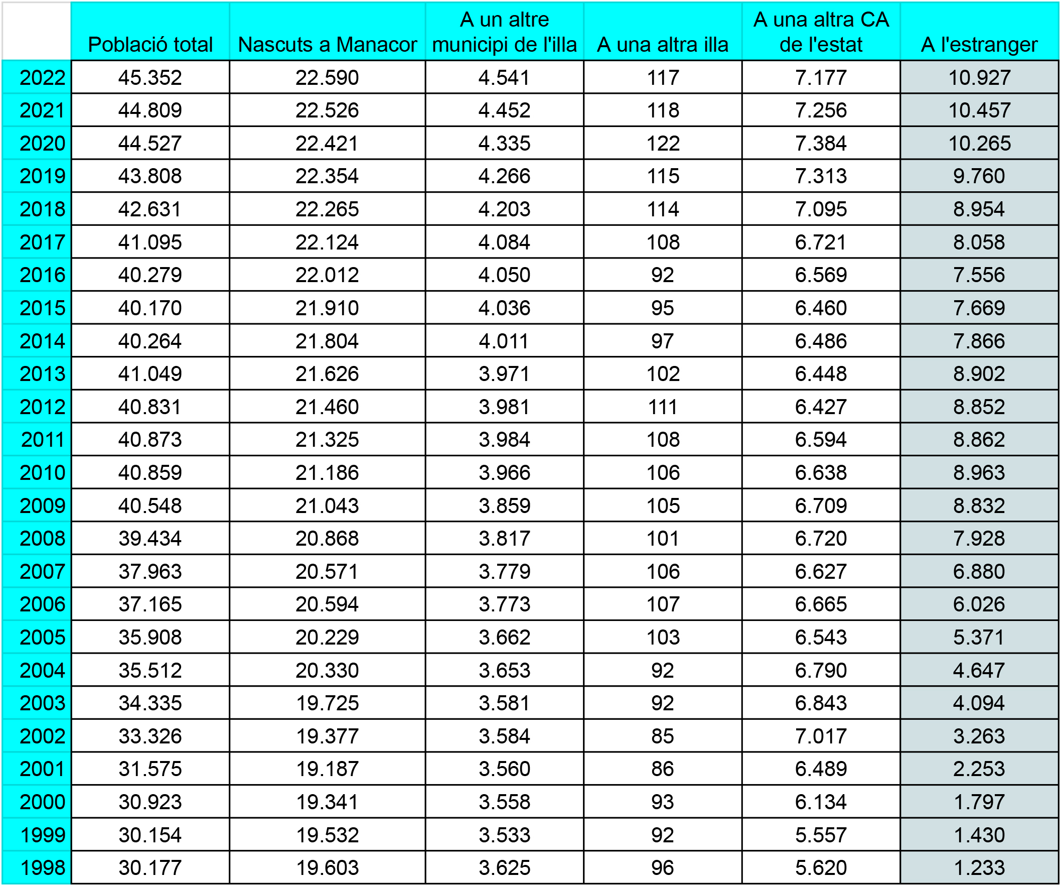 L’any 1998, a Manacor hi vivien 1.233 persones que havien nascut a l’estranger. Avui són 10.927, pràcticament nou vegades més. Entre el 1998 i el 2010 aquest creixement migratori va ser constant i ininterromput, fins a assolir la xifra dels 8.963 nascuts a l’estranger. Aquesta davallada durà fins al 2016, en què els nascuts fora de l’estat suposaven un total de 7.556 persones. De llavors ençà, cada any s’han instal·lat a Manacor més de 500 persones nascudes a l’estranger.