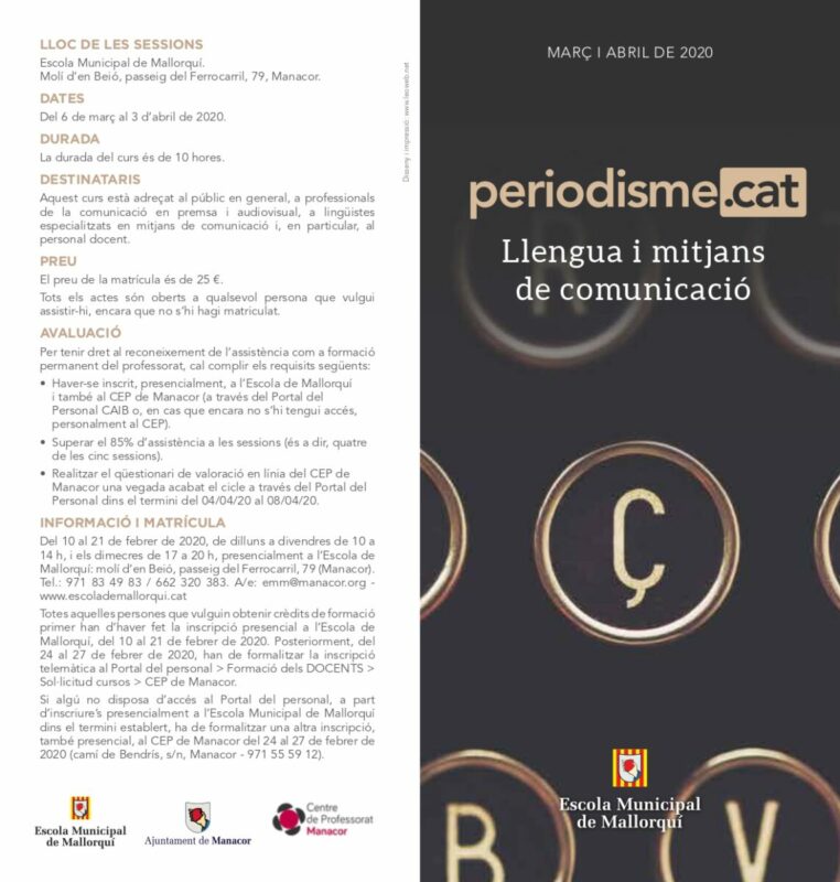 Amb l’objectiu de reflexionar sobre el model lingüístic i també sobre els usos de la llengua catalana als mitjans de comunicació, l’Escola de Mallorquí ha organitzat per a aquesta primavera un curs monogràfic que comptarà amb la participació de periodistes i lingüistes d’arreu dels Països Catalans, tant de Mallorca, com també del Principat de Catalunya i del País Valencià.