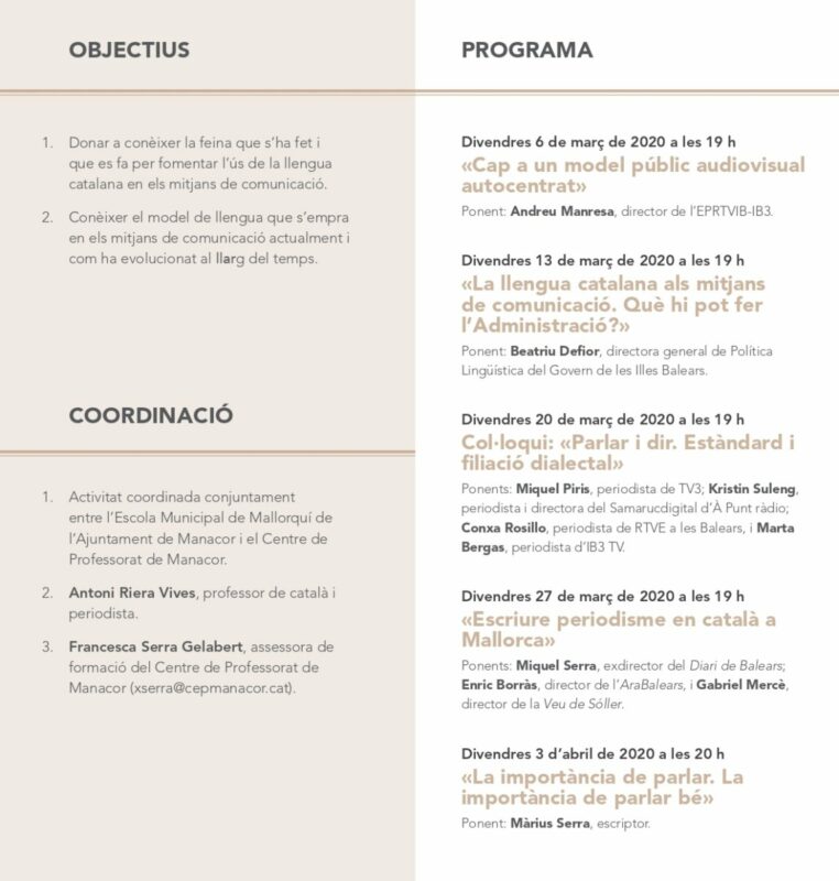 Així, el cicle s’iniciarà amb la participació d’Andreu Manresa, director de la ràdio i televisió autonòmiques IB3. La segona de les ponències anirà a càrrec de la directora general de Política Lingüística, Beatriu Defior, que parlarà del paper de l’Administració respecte de la presència de la llengua catalana als mitjans.