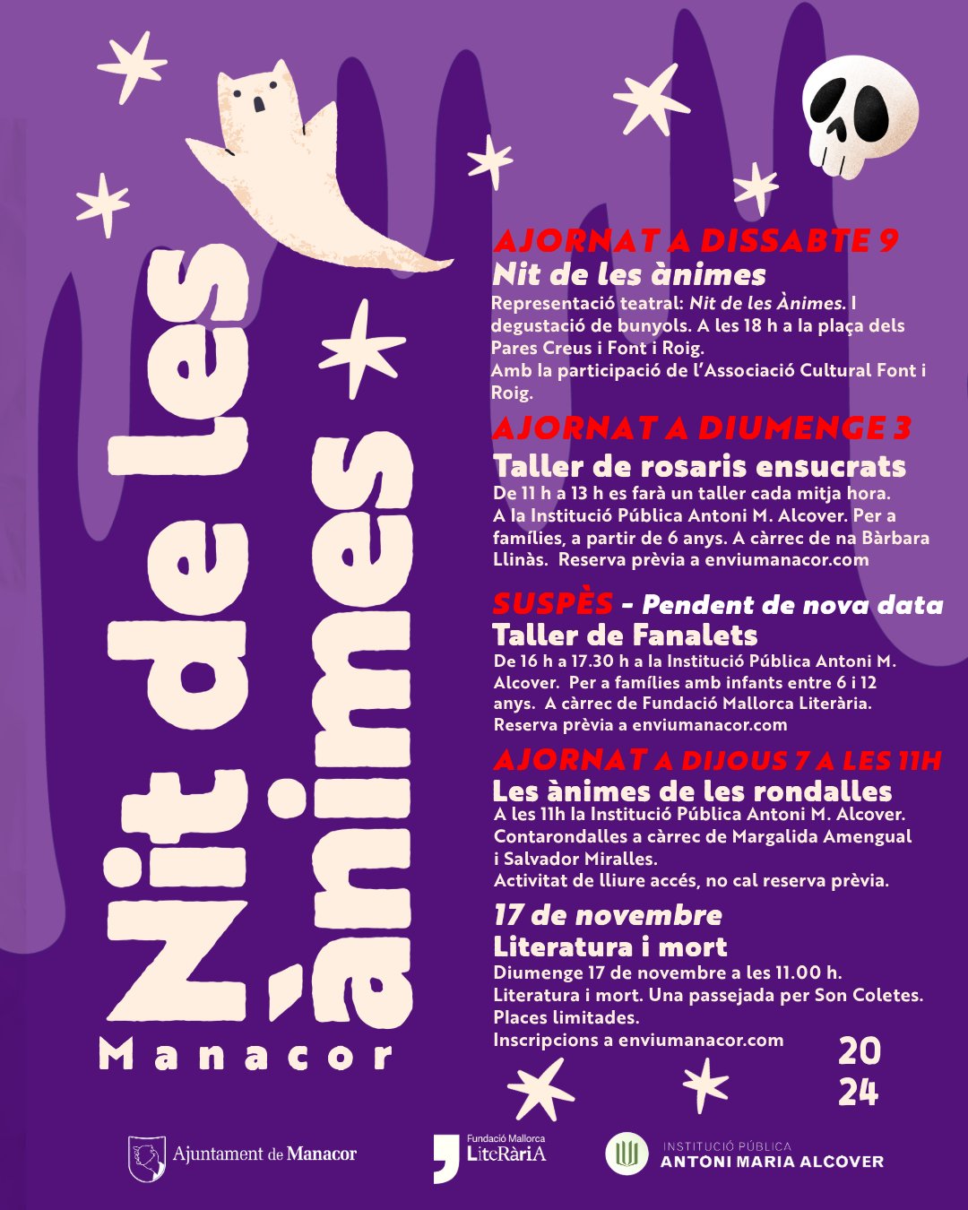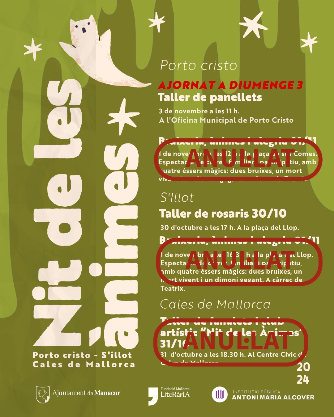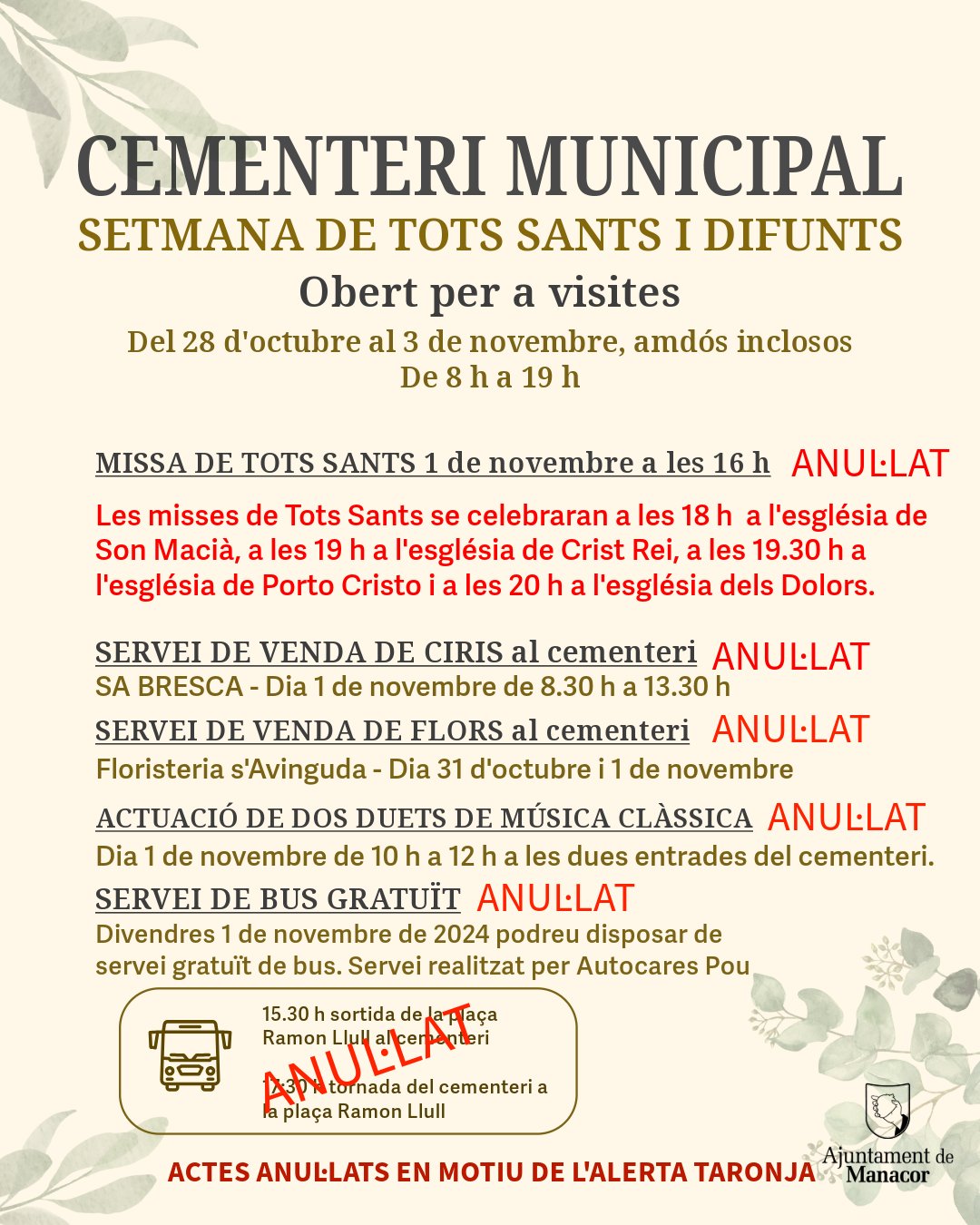 Com se sap el Govern espanyol ha decretat tres dies de dol en senyal de solidaritat amb les més de 150 víctimes mortals arran de la DANA al País Valencià. Això ha fet que ja s’hagin suspès moltes de les activitats festives previstes. Al dol, però, s’hi ha d’afegir la prevenció per l’arribada del temporal a Mallorca. És per aquest motiu també que l’Ajuntament de Manacor ha anul·lat totes les activitats relacionades amb la festivitat de Tots Sants. Així idò, totes les activitats previstes per a avui al cementeri de Son Coletes queden anul·lades, i altres activitats de caire més festiu o lúdic es passen al cap de setmana vinent.