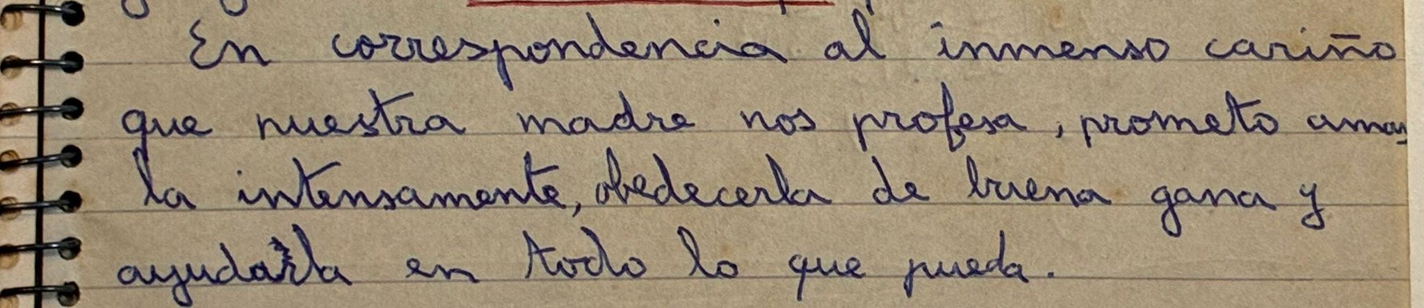 La família. "En correspondencia al inmenso cariño que nuestra madre nos profesa, prometo amarla intensamente, obedecerla de buena gana y ayudarla en todo lo que pueda". Les activitats per celebrar el Dia de la Mare o el Dia del Pare eren una constant i servien per senyalar els progenitors com les corretges de transmissió de valors. Només hi havia un model de família vàlid, i s'havia de fer tenir ver. Com es diu en bon mallorquí: "Creure és criança".