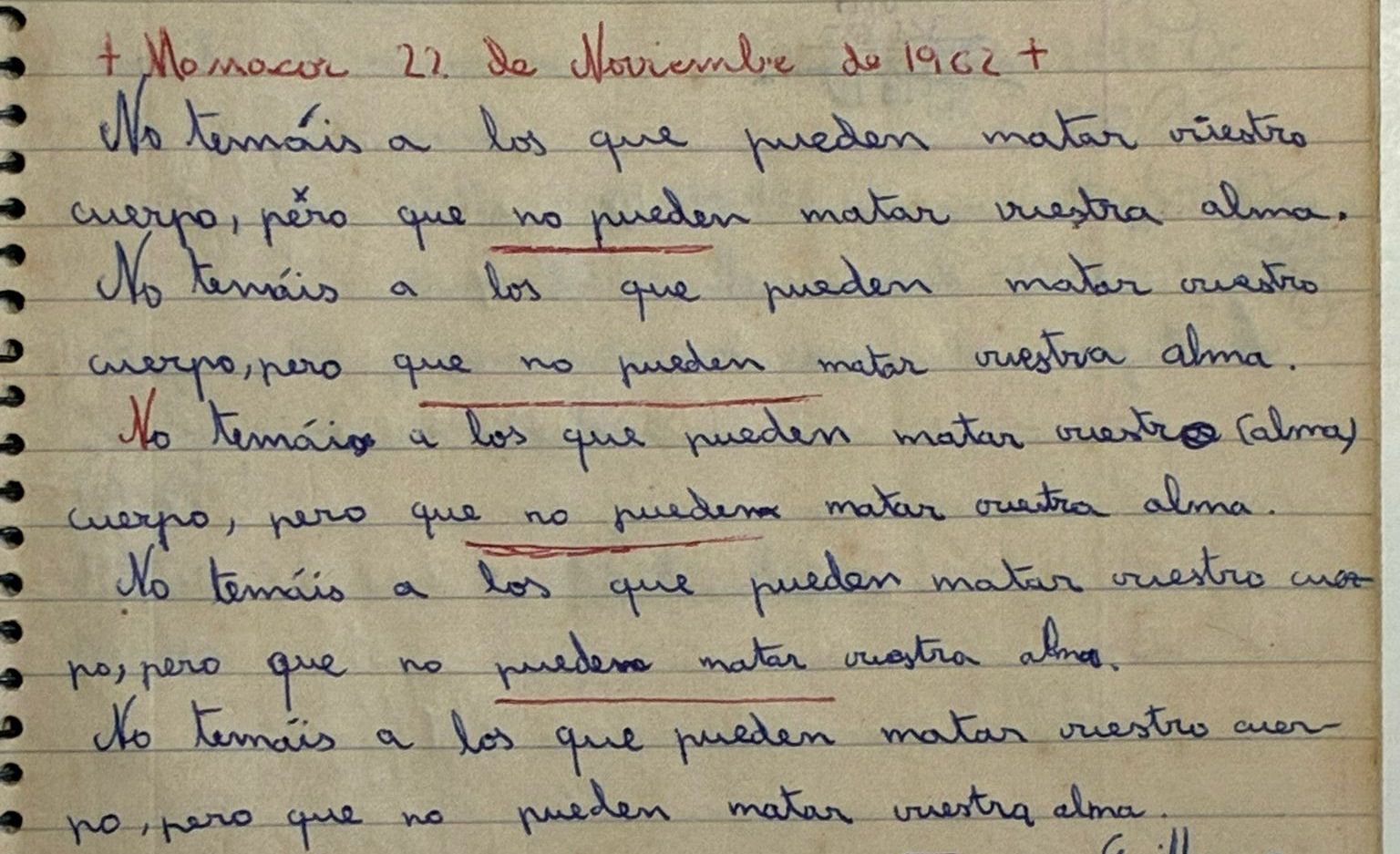 L'amenaça. "No temáis a los que pueden matar vuestre cuerpo, pero que no pueden matar vuestra alma". Un missatge moralitzador de coratge i estoicisme davant el patiment que un dia pugui venir a mans de qualcú altre. L'amenaça constant... tot i que la guerra feia més de vint anys que havia acabat. Fins a sis vegades consecutives, ho repetien.