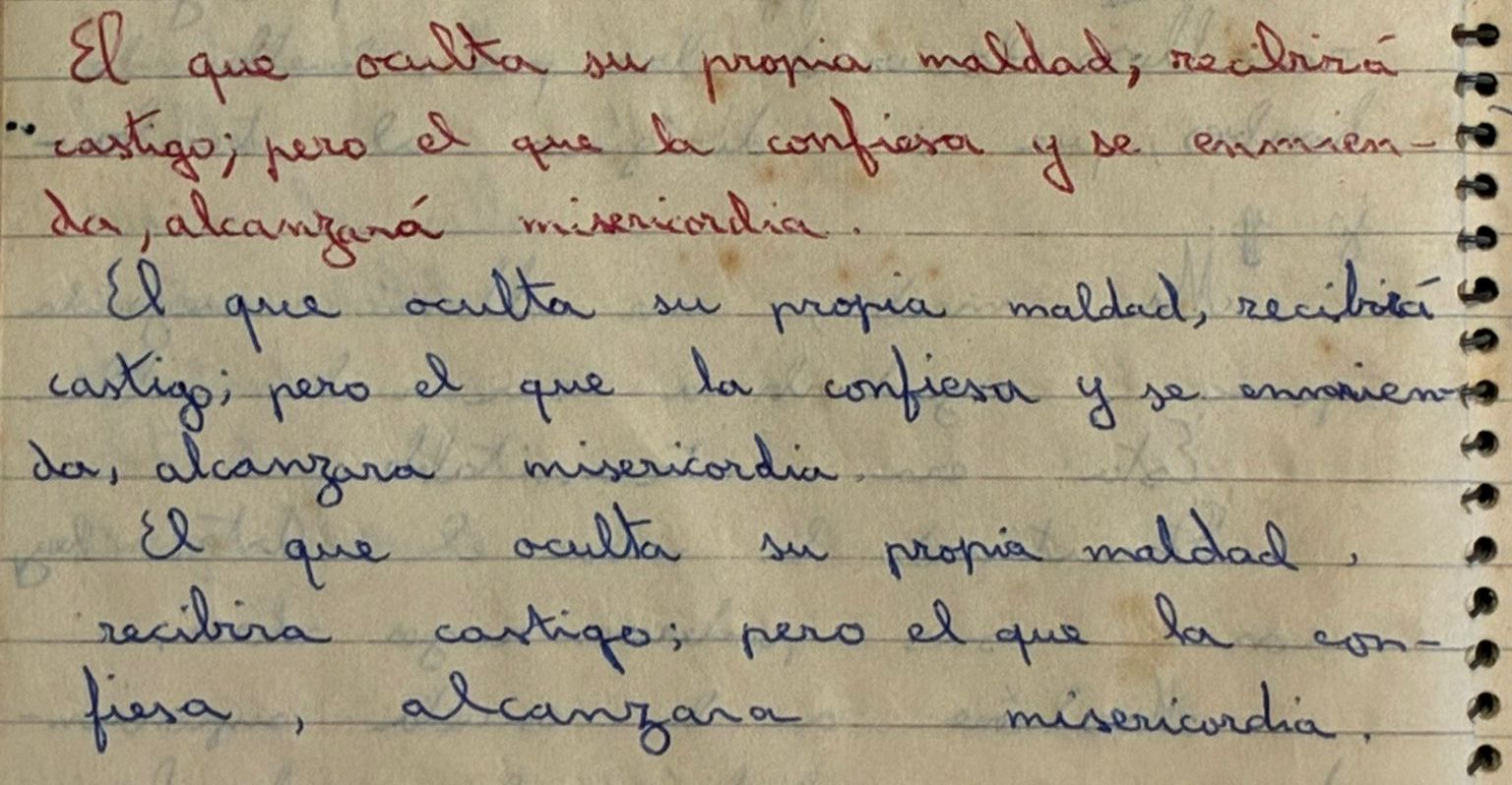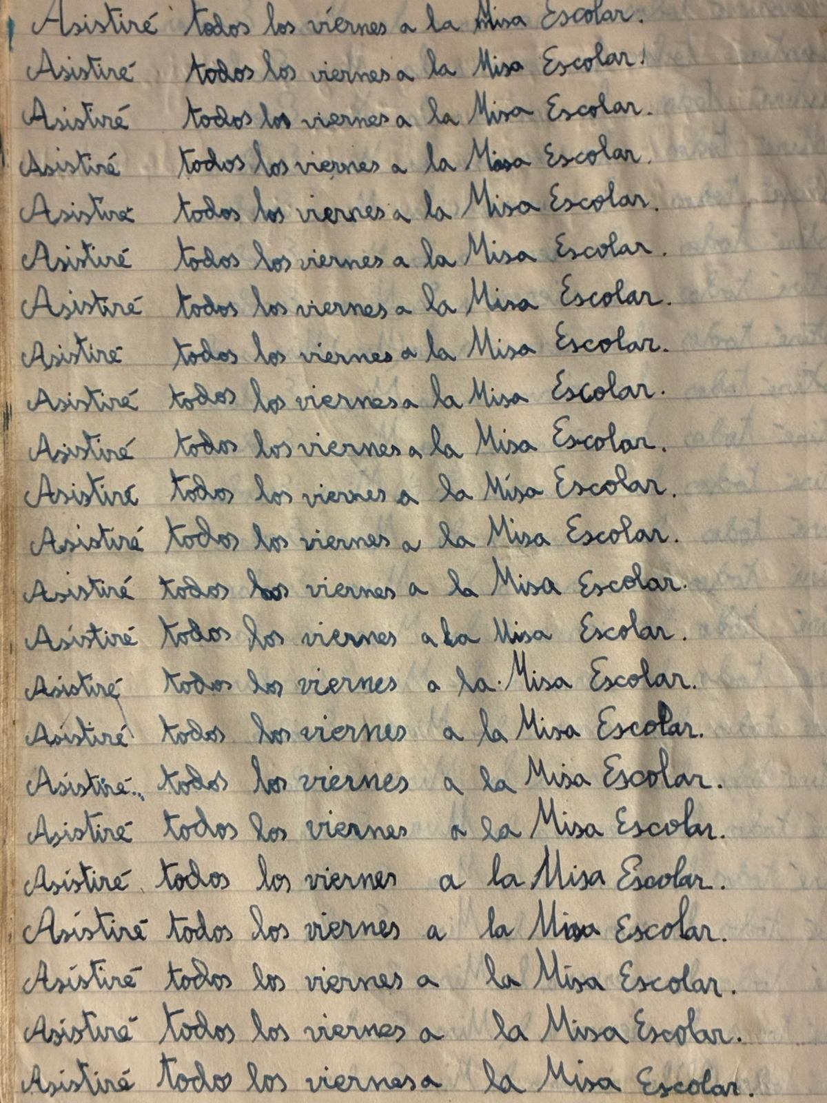 La repetició. La moral partia sempre i per sempre d'una font primigènia i immutable. L'església. No anar a missa escolar el dia que tocava tenia conseqüències directes. Aquesta és una de les tres pàgines de càstig per haver salat la missa del divendres.