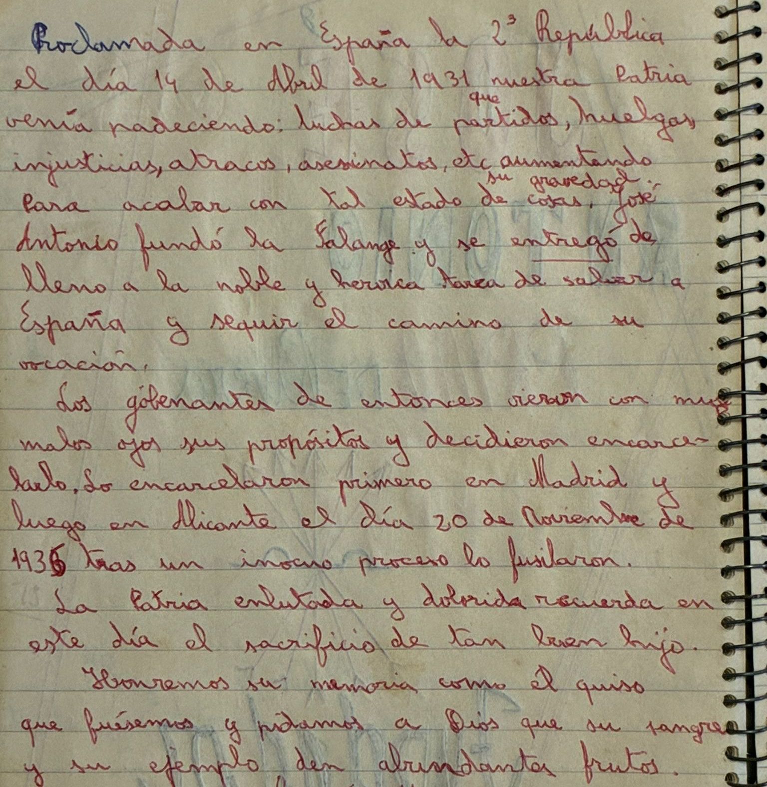 Les idees. José Antonio Primo de Rivera, fundador de la Falange, tenia sempre el seu dia de glòria. El jou i les fletxes. Els colors de la bandera espanyola en el dibuix. Les dues franges vermelles amb el primer nom i el primer llinatge. El groc de fons. I el blau que hi combina. Les referències en els quaderns a José Antonio Primo de Rivera i al dictador Franco són constants, i sempre en clau laudatòria, per descomptat. Un missatge clar i llampant contra la República i a favor dels colpistes que s'alçaren contra la democràcia. "Y pidamos a Dios que su sangre y su ejemplo den abundantes frutos", acabava explicant la història de José Antonio Primo de Rivera, el màrtir més gran del "Movimiento nacional".