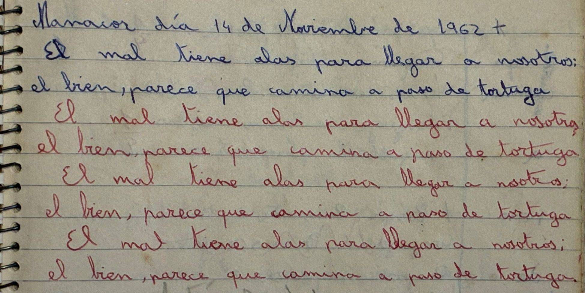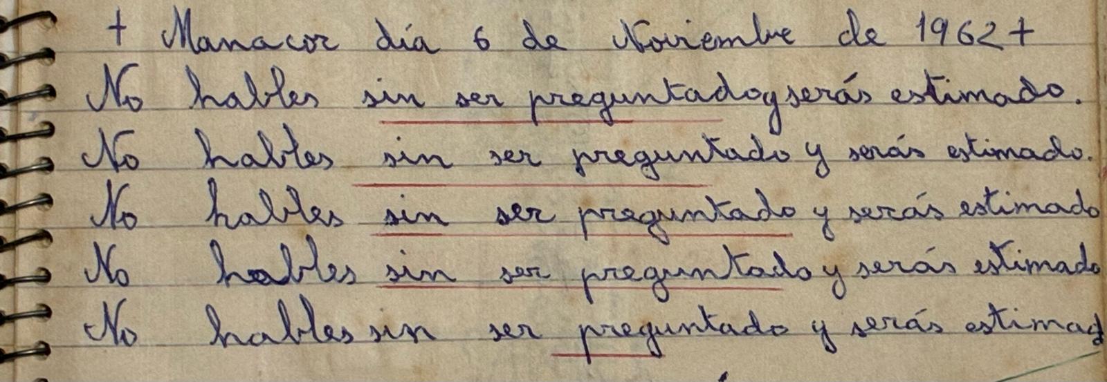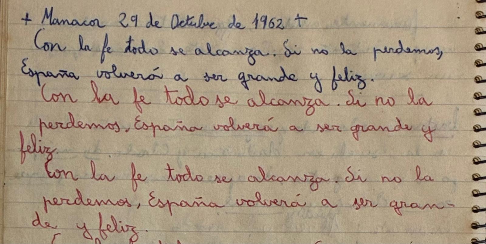 Avui que s’usa dir paraules sense saber què signifiquen hem tengut accés a tot un seguit de quaderns escolars d’un alumne de l’antiga escola de “Cristo Rey”. Es tracta d’una mostra del que és un vertader adoctrinament escolar, ara que la paraula està tan en boca de tothom. Segons el DIEC2, “adoctrinar” pot tenir dues accepcions. La primera: “instruir algú en alguna cosa”. La segona, que s’avé més amb el sentit que li donen certes persones, “fer entrar algú en certes doctrines, en certes opinions”.