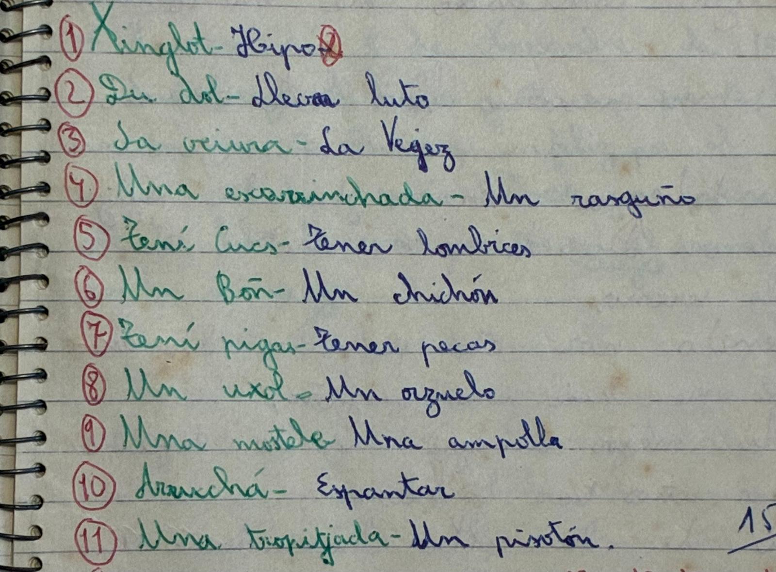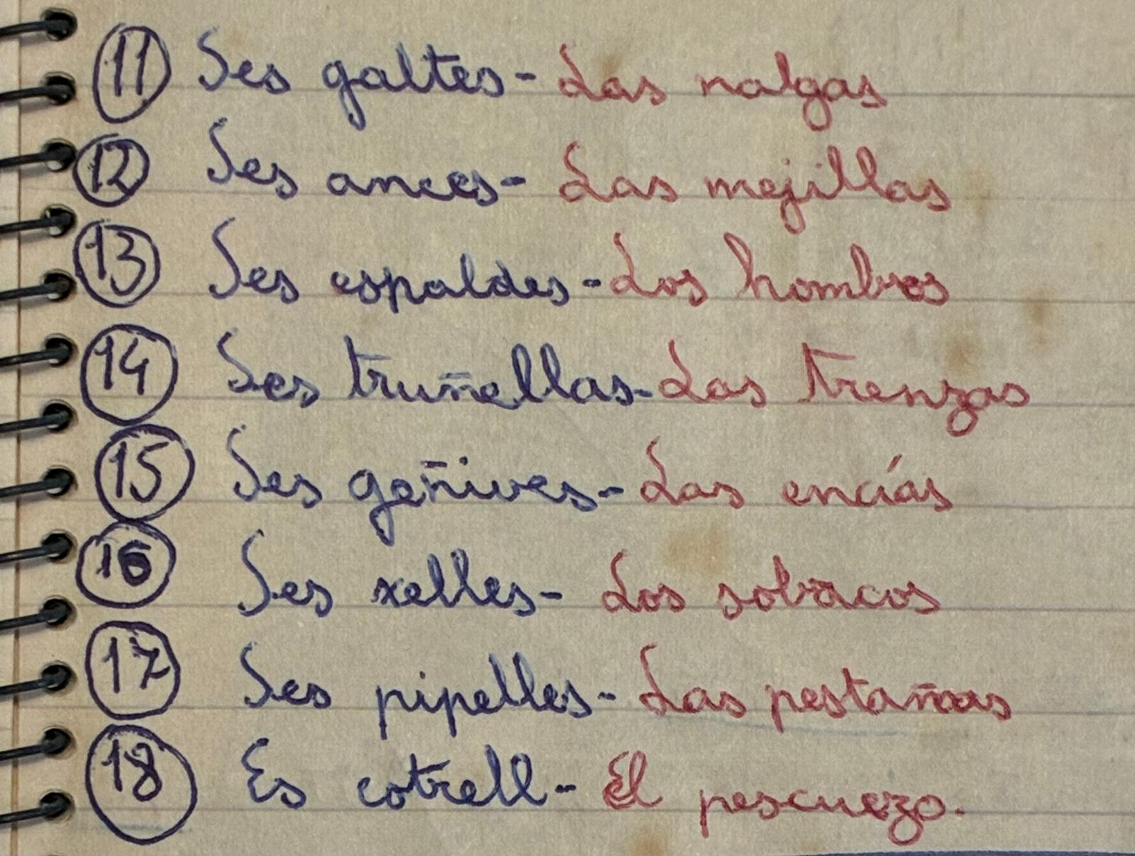 La llengua catalana. Els alumnes d'avui, per norma general, tenen una mancança de vocabulari important. Si és en llengua catalana, més, independentment de l'origen que tenguin. Els infants d'avui diuen "hipo", "peca", "chichón", i no saben com ho han de dir en català. Els anys seixanta la situació era totalment a la inversa. Els infants tenien singlot si havien menjat massa aviat, o pigues, si eren rossencs de pell, o es feien bonys i escarrinxades, si queien o qualcú els pegava. La mancança de vocabulari la tenien en llengua espanyola, i per això el professor, totalment afí a les circumstàncies del moment, els mostrava com es deien en la llengua de l'imperi, totes aquelles paraules. Ja es veu, però que de vegades hi havia confusions i les galtes eren les "nalgas" i les anques, les "mejillas"...