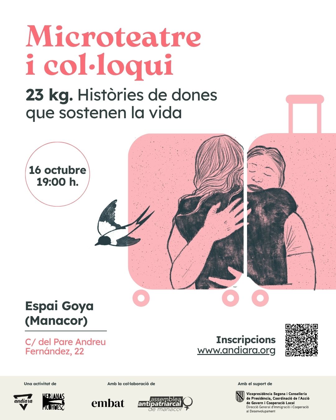 El pròxim 16 d’octubre a les 19 h l’Espai Goya acollirà el microteatre “23 quilos. Històries de dones que sostenen la vida”, una obra de microteatre realitzada per Hermanas Picohueso basada en el documental “Cuidant-nos. Històries de dones que sostenen la vida” de l’associació Andiara.