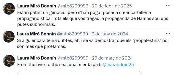 I és que Laura Miró, més enllà de la seva tesi doctoral, s’ha dedicat a negar el genocidi del poble palestí i a fer befa -malgrat les seves declaracions- dels assassinats a la Franja de Gaza i a Cisjordània. I com a mostra, algunes piulades a la xarxa social X on se’n riu dels càntics de llibertat de Palestina i del genocidi. Una persona que també ha dedicat gran part de les seves intervencions públiques a atacar la solidaritat cap a Palestina. Actuacions, en definitiva, de com opera el sionisme, és a dir, la ideologia política que defensa l’aniquilació de Palestina en pro de la construcció de l’entitat d’Israel.