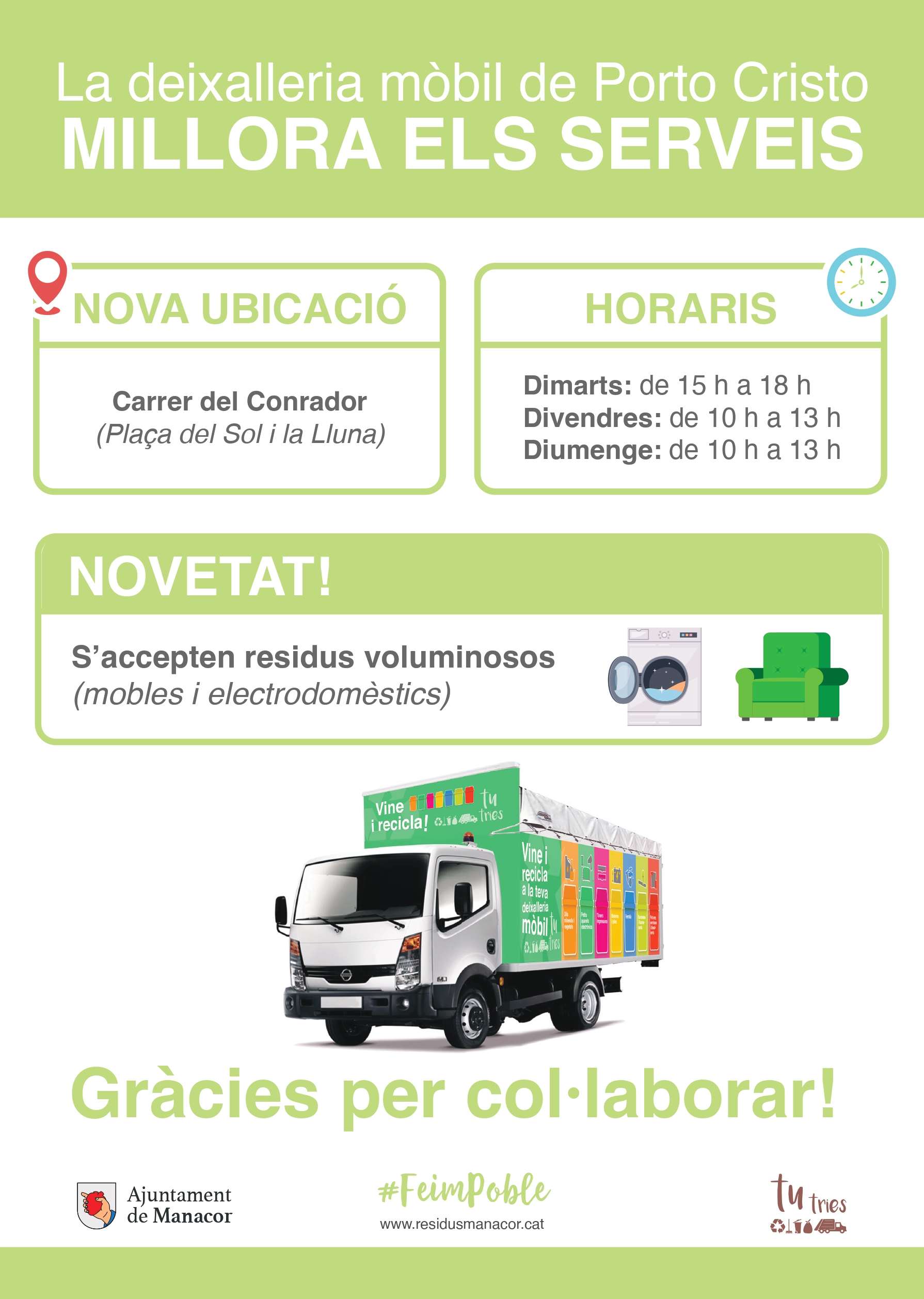 L’Ajuntament de Manacor ha presentat aquest divendres una “important” millora en el servei de la deixalleria mòbil a Portocristo. Ho fan, expliquen en una nota de premsa “adaptant-se a les necessitats dels veïnats per mitigar l’abandonament de residus voluminosos i altres trastos a la via pública” i amb l’objectiu “d’oferir una alternativa eficient i còmoda per gestionar els residus i reduir l’incivisme detectat en els darrers anys”.