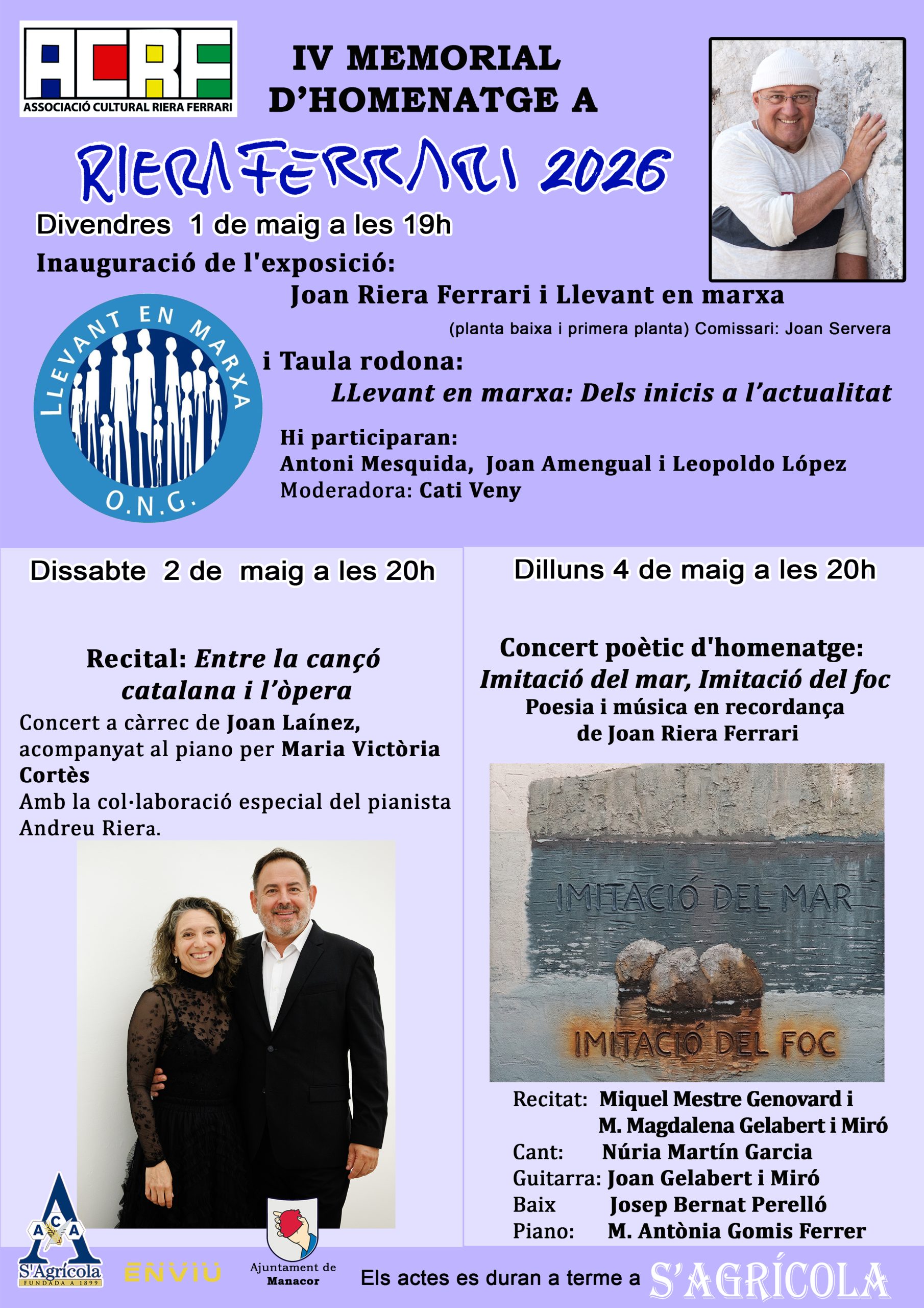 Per quart any consecutiu, l’Associació Cultural Riera Ferrari organitza un memorial per tal de retre homenatge a la figura del pintor manacorí Joan Riera Ferrari. Els actes commemoratius s’inicien el pròxim 1 de maig de 2026 amb una doble proposta. A partir deles 19h a S’Agrícola, s’inaugurarà l’exposició Joan Riera Ferrari i Llevant en marxa amb un seguit de fotografies i altres elements representatius. L’exposició, comissariada per Joan Severa, ocuparà la planta baixa i la primera planta de l’edifici de l’Associació Cultural S’Agrícola.