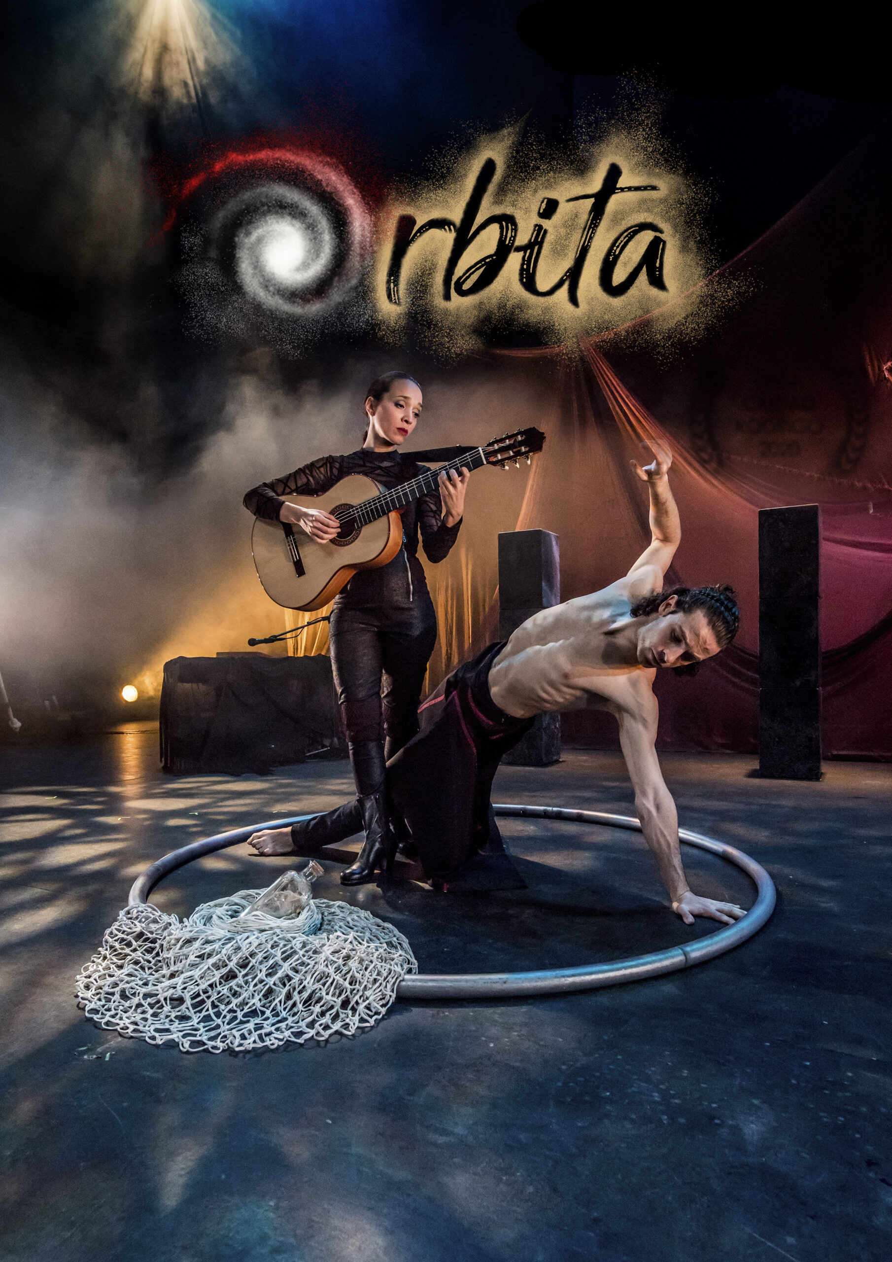 Una òrbita és la trajectòria que descriu un objecte físic al voltant d’un altre sota la influència d’una força central. Aquest fenomen representa la relació que s’estableix entre Carlos López i Noemí Pareja, dos artistes polifacètics que interaccionen a través de diferents llenguatges contemporanis de moviment, elements de circ i la música en viu sota l’atracció gravitatòria de les seves arrels: Cadis, el mar i l’art.