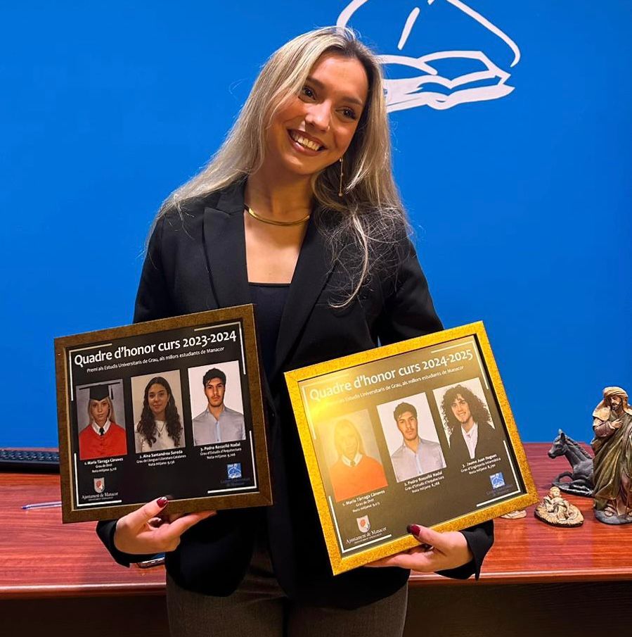 Maria Tàrraga Cànaves (Manacor, 2003) és graduada en dret des d'aquest mateix 2025 per la Universitat Complutense de Madrid. Aquesta setmana ha rebut el premi acadèmic com a millor estudiant de grau manacorina, amb una nota mitjana de 9,718 i un total de vuit matrícules d'honor.