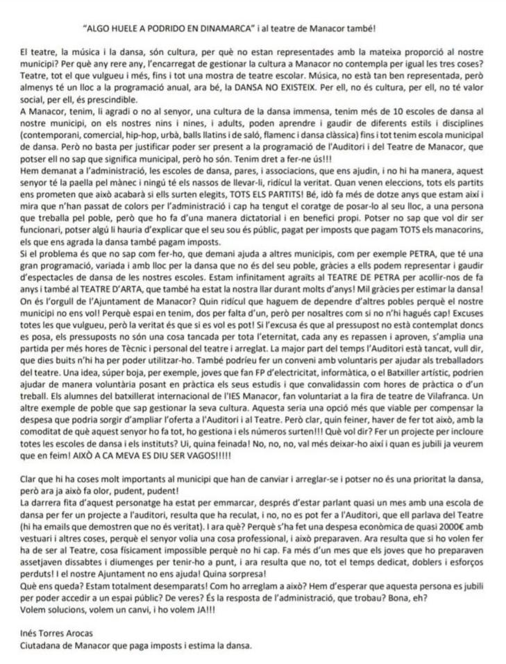 “On és l’orgull de l’Ajuntament de Manacor? Quin ridícul que haguem de dependre d’altres pobles perquè el nostre municipi no ens vol… perquè d’espai en tenim, dos per falta d’un, però per nosaltres com si no n’hi hagués cap”. Així s’expressa Inés Torres Arocas, “ciutadana de Manacor que paga imposts i estima la dansa”, en una carta molt contundent on qüestiona els criteris que se segueixen a l’hora de cedir els espais del Teatre i l’Auditori de Manacor. Els estires-i-amolles del Teatre amb les escoles de dansa fa anys que duren i, de fet, aquesta mateixa ciutadana explica que “quan venen eleccions, tots els partits ens prometen que això acabarà si ells surten elegits, tots els partits. Bé, idò fa més de dotze anys que estam així i mira que n’han passats, de colors per l’administració i cap ha tengut el coratge de posar-lo al seu lloc”, diu en referència al gerent del Teatre. Aquesta vegada, com d’altres, la qüestió ha arribat també al ple municipal on es va treure a rotlo un suposat canvi de criteri de la gerència a l’hora de decidir i l’acadèmia de dansa podia fer la seva actuació. Diu Inés Torres a la seva carta: “Després d’estar parlant quasi un mes amb una escola de dansa per fer un projecte a l’Auditori, resulta que ha reculat, i no, no es pot fer a l’Auditori, que ell parlava del Teatre (hi ha emails que demostren que no és veritat). I ara què? Perquè s’ha fet una despesa de quasi 2.000 euros amb vestuari i altres coses, perquè el senyor volia una cosa professional, i això preparaven”. I acaba dient: “Ara resulta que si ho volen fer ha de ser al Teatre, cosa físicament impossible perquè no hi cap”.