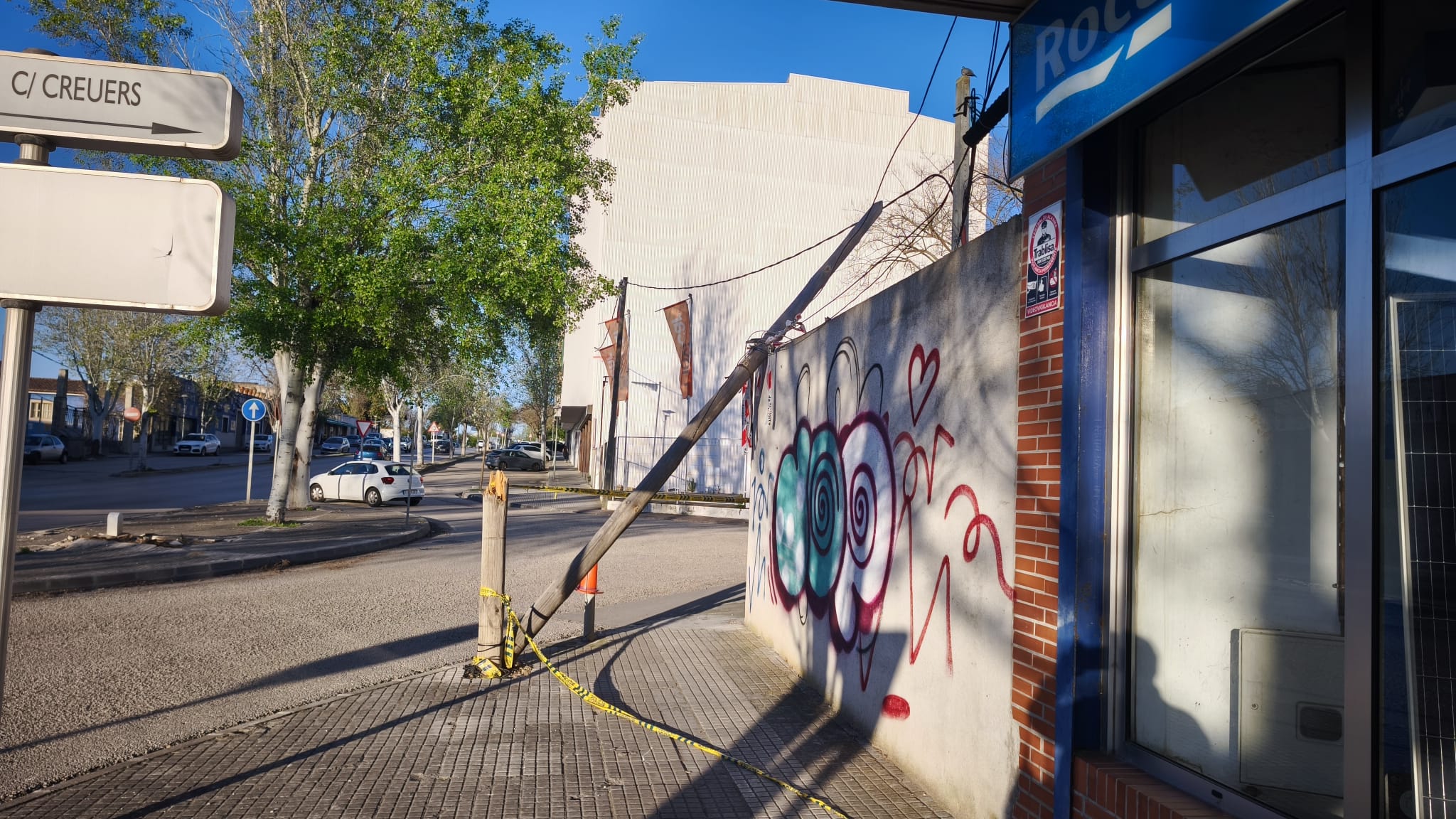 En aquest estat es troba un dels pals d’electricitat situat a via Palma amb carrer Creuers d’ençà de la ventada de Setmana Santa, en què hi va haver alerta groga per vent i ratxes de fins a 80 km/h.