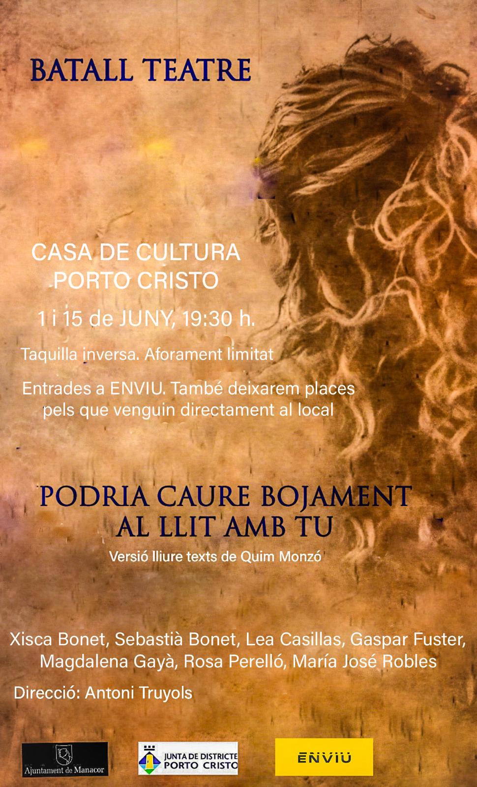 “Podria caure bojament al llit amb tu” es representarà dia 1 i 15 de Juny a les 19:30 hores a la Casa de Cultura de Porto Cristo. S’ha de tenir en compte que l’aforament és limitat. Les entrades estan a ENVIU, però també hi haurà places reservades per a qui vagi directament al local. Agraïm a la Delegació de Portocristo de l’Ajuntament l’oferiment de subvenció però hem optat per fer taquilla inversa.