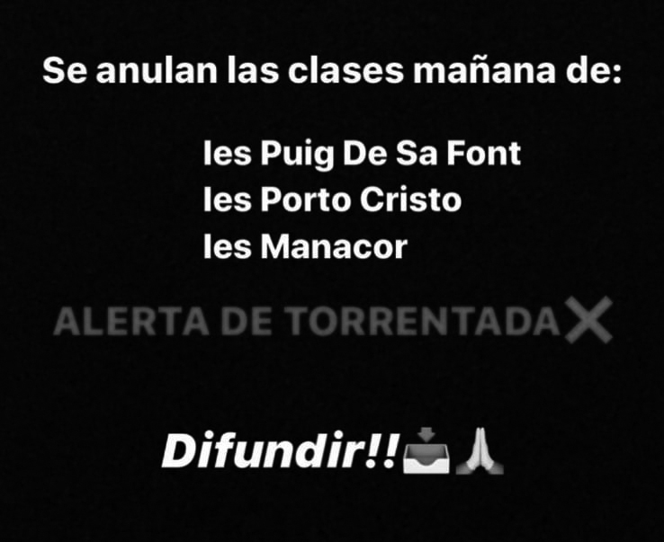Aquesta setmana de llevantada i aigua diària ha estat aprofitada per qualque polissó per mirar de fer creure que la marededéu nom Joana. Aquesta gent tan vivaretxa, a banda de banalitzar un fet tan recentment luctuós com la torrentada llorencina, anaven ben errats d’osques. En un dels missatges difosos per una aplicació de missatgeria mòbil alertaven que les classes s’haurien suspès als instituts de Porto Cristo, Son Servera i IES Manacor, però obviaven el Mossèn Alcover, que justament té el torrent que hi passa ben arran… I per paga, comunicacions en espanyol… Ben turmassot havia de ser qui s’ho cregués…