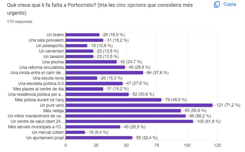 D’entre vint ítems proposats, el que se n’ha duit el vot de la majoria dels enquestats (121) ha estat el punt verd. Fa anys que Portocristo no té aquesta infraestructura és inexistent al poble i és ben coneixedor als carrers. També reclament (105) un centre de salut obert les 24 hores. Les tres opcions següents estan relacionades amb els serveis municipals que s’hi ofereixen. Reclamen més manteniment als carrers, tant pel que fa a l’asfaltat com a les voreres (99), més neteja (95) i més policia durant tot l’any (89).
