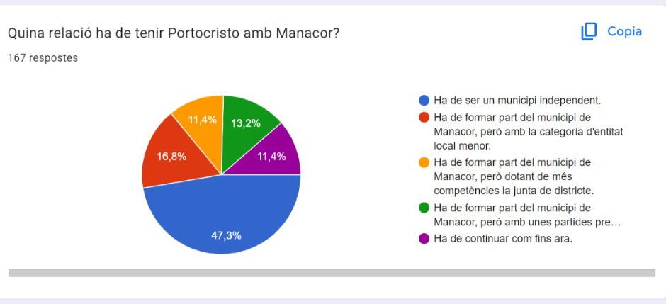 Quan els demanam per la relació que creuen que hauria de tenir Portocristo amb Manacor, una 47,3 voldrien que fos un municipi indpendent. un 16,8 desitgen que sigui entitat local menor i un 13,2 per cent volen un pressupost propi. Un 11,4 voldrien més competències per a la junta de districte. I només un 11,4 per cent voldrien que tot continuàs com fins ara.