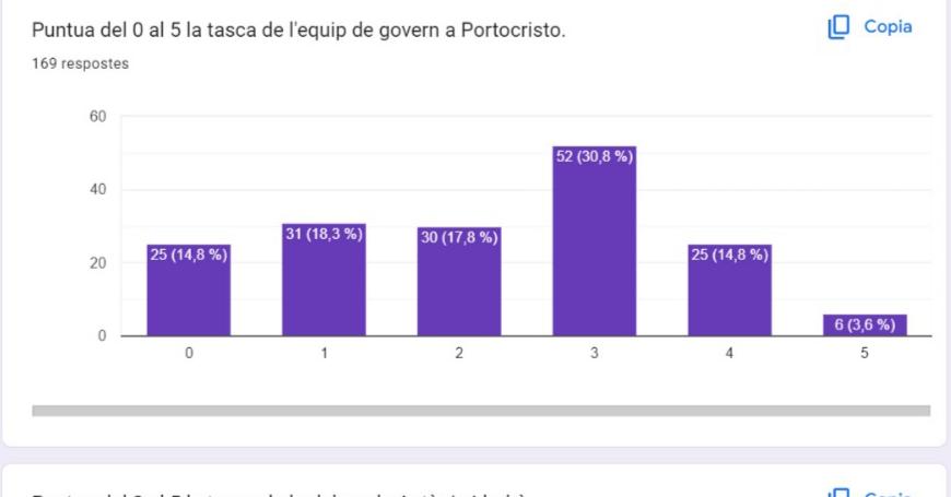 Els enquestats són crítics amb la gestió de l’equip de govern, que suspenen amb un 2,21, molt apropet de l’aprovat. En canvi, es mostren més indulgents amb la delegada de Portocristo, Antònia Llodrà, que treu un 3,02 sobre 5.