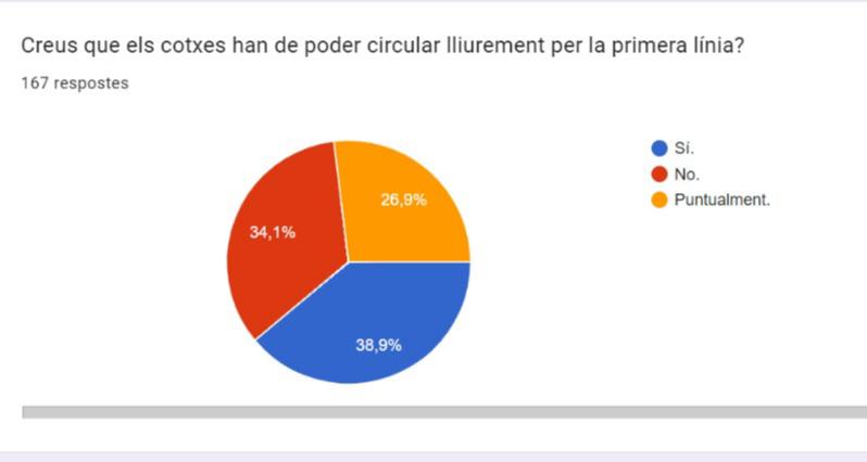 Ha estat molt polèmic el tancament al trànsit del carrer de Bordils, ara reobert en sentit de pujada i a una velocitat màxima de 20 quilòmetres per hora. Un 38 per cent dels enquestats considera que els cotxes haurien de poder circular lliurement per aquest carrer. En canvi, un 34 per cent pensen que no hi haurien de passar cotxes. Un 26,9 per cent creu que n’hi podrien passar, però només de forma puntual.
