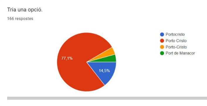 Hem demanat als enquestats pel nom del poble. Com se sap, el decret de toponímia del 1988 establia que la grafia oficial havia de ser Portocristo, mentre que una sentència judicial posterior marcava la de Porto Cristo. Un 77 per cent dels enquestats es decanten per aquesta segona opció. Mentre que un 14 optaria per la forma aglutinada Portocristo. És curiós que un 7 per cent vulgui encara Port de Manacor.