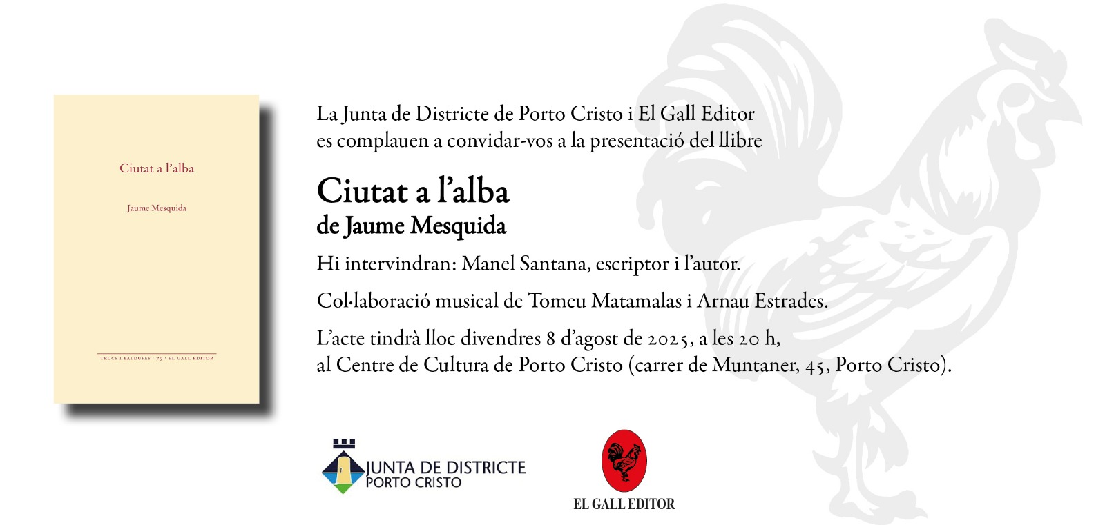 Jaume Mesquida (Palma, 1948) va néixer lluny de Manacor perquè son pare jugava amb el Mallorca. Aviat la família vengué cap aquí. “De petit, parlava en castellà”, diu, “i quan vaig arribar a Manacor ningú m'entenia”. De fet, no es va plantejar canviar la seva llengua de creació fins que conegué Miquel Àngel Riera, que li recomanà d'escriure en català. Ara, amb Edicions del Gall, recupera Ciutat a l'alba, un llibre escrit originàriament en espanyol que ell mateix ha traduït al català. El volum es presenta al Centre de Cultura de Portocristo, dia 8 d'agost a les 20h. La presentació comptarà amb la participació de Manel Santana i l'actuació de Tomeu Matamalas i Arnau Estrades.
