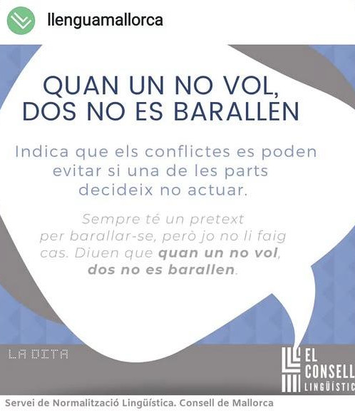 Just el mateix dia que es feia públic l’acord de govern entre MÉS-Esquerra, AIPC i el PSOE, el compte Llengua Mallorca del Consell de Mallorca publicava un refrany o frase feta que molts tenim present. Devien estar preocupats també al Consell per com s’anaven succeint els esdeveniments a Manacor? Creis en les casualitats, vosaltres? El cas és que també el Servei Lingüístic de l’Ajuntament manacorí, comandat per Sebastià Llodrà, va repiular la publicació aquell mateix dia, també. Sigui com sigui, la saviesa popular no sol anar mai errada de comptes, i en aquest cas ha tornat a endevinar. Ha bastat que un dels dos no es volgués barallar perquè la cosa finalment s’hagi compost a Manacor. La pregunta que es fa tothom, però, és: “Quin dels dos ha estat, que no s’ha volgut barallar pus?”.