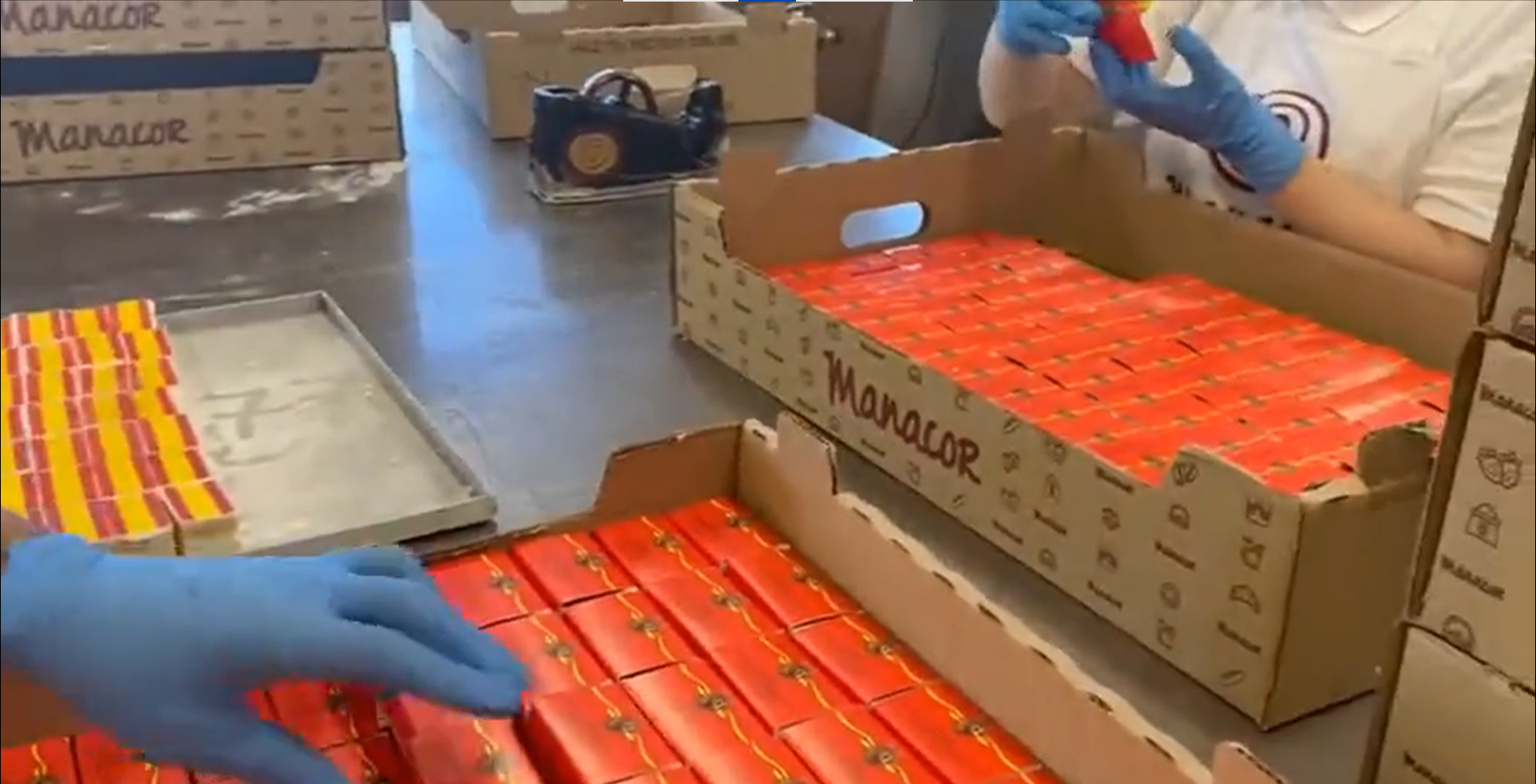Com es pot veure en el vídeo amb lletres ben clares i ben grosses, les caixes amb aquests pastissets duen el nom de Manacor, sense que s’hi precisi, però, quina és l’empresa que fabrica aquests dolços, que duen una cobertura amb els colors de la bandera espanyola?