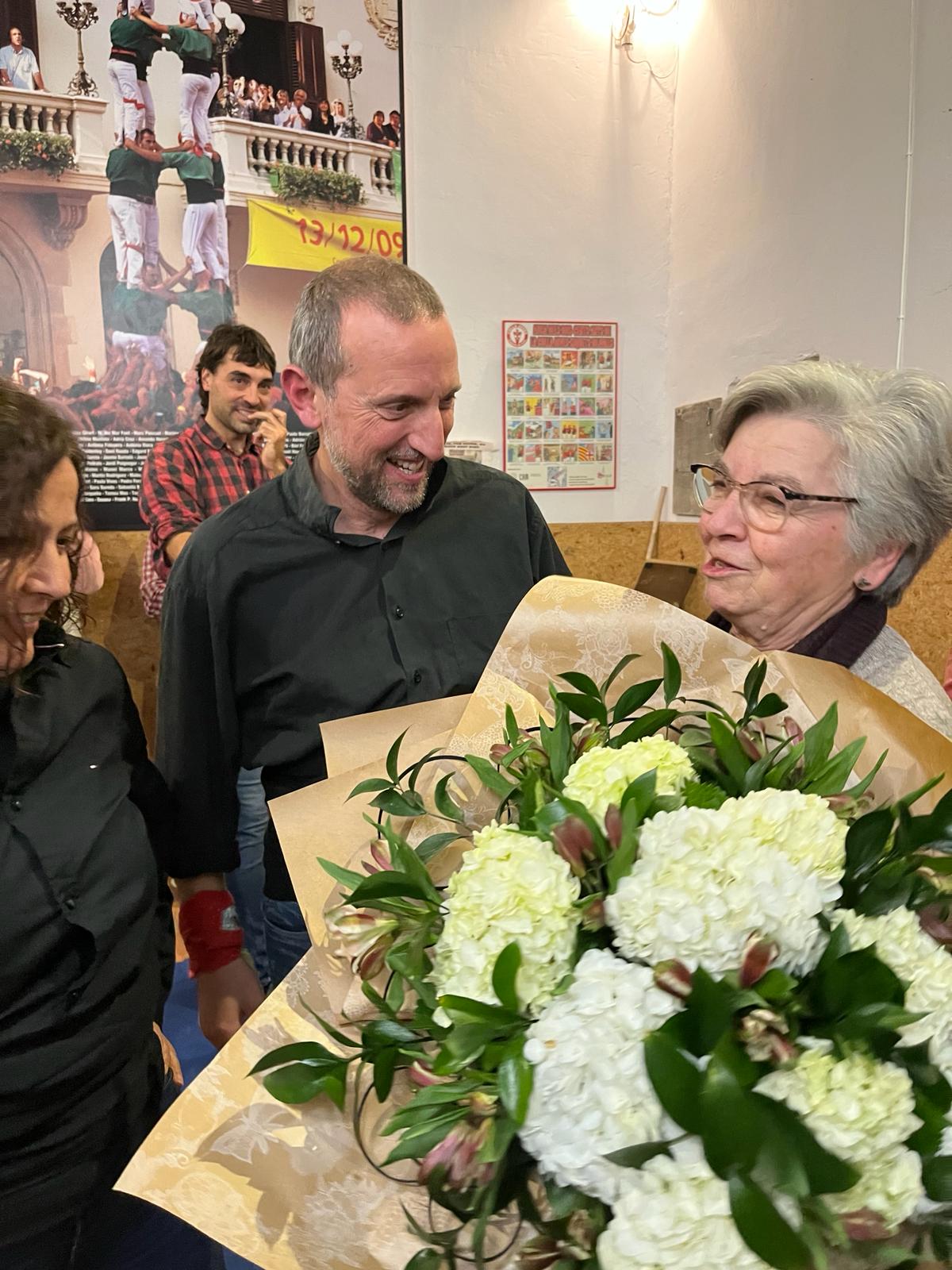 Na Catalina no és una castellera activa, però no és només mare de castellers. És una dona que encara que no hagi vestit mai camisa castellera, ni faixa, ni mocador, s’ha guanyat a pols ser part d’aquesta família. És una d’aquelles dones que saben fer de tot i que tot ho fan bé: feinera, resolutiva, cuinera, altruista, amable, generosa, sempre amb un somriure a la cara i sense fer renou. Des de sempre ens ha obert les portes de ca seva: a les matinades dels nostres grallers a la Diada de la colla, per muntar els ninots pels foguerons, ens ha ajudat amb les paradetes de marxandatge, ha col·laborat infinites vegades amb l’elaboració de menjars per les colles convidades, ens ha regalat les millors ensaïmades casolanes de Mallorca (o del món!) i fins i tot, ens va obrir les portes per fer matances castelleres. Tot això i més, ho ha fet essent invisible per molts de castellers, perquè mai surt a les fotografies pròpies dels castells. No la trobareu ni als troncs ni a les pinyes, però sempre ha estat present al darrere, ajudant en allò que ha pogut i aportant molta feina. Per això amb aquestes paraules pronunciades, en primer lloc, a l’acte de dissabte passat, en família, li volem agrair tot el que ha fet i li volem posar cara i que aquesta sigui ben visible. No podem estar més contents de tenir dins la nostra família castellera gent com ella que sempre fa pinya. Donar-te les gràcies és poc Catalina!